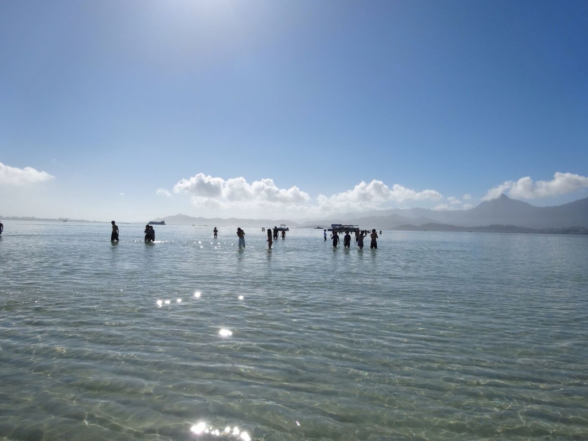 私が参加したこの日も、干潮の時間帯は朝の6時台でしたので、海に浮かび上がる白い砂浜を見るのは難しかったですが、大海原の真っただ中で、膝丈の海水が覆う白砂の上を歩くという経験が出来ました。