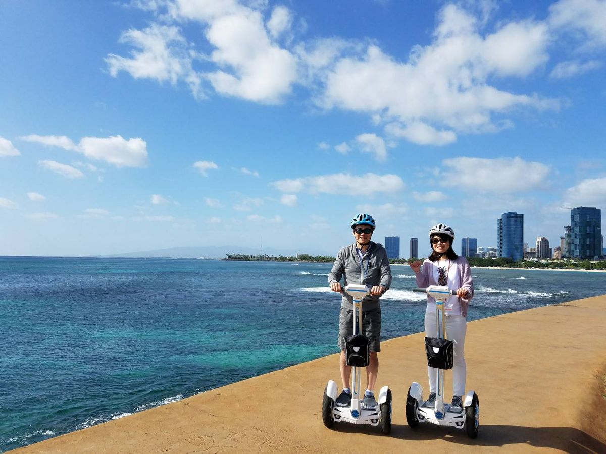 以前からテレビなどでセグウェイを見て、一度は乗ってみたいと、今回の体験ツアーに参加しました。実際はセグウェイよりコンパクトなタイプでしたが、こちらの方が小回りもきいて運転?操作しやすかったです。最初に少し操作や乗り方を教わった後は、海岸の公園へゴー!段差などには気を付けなくてはいけないけど、海岸線をハワイの風を受けて走ればサイコー!!