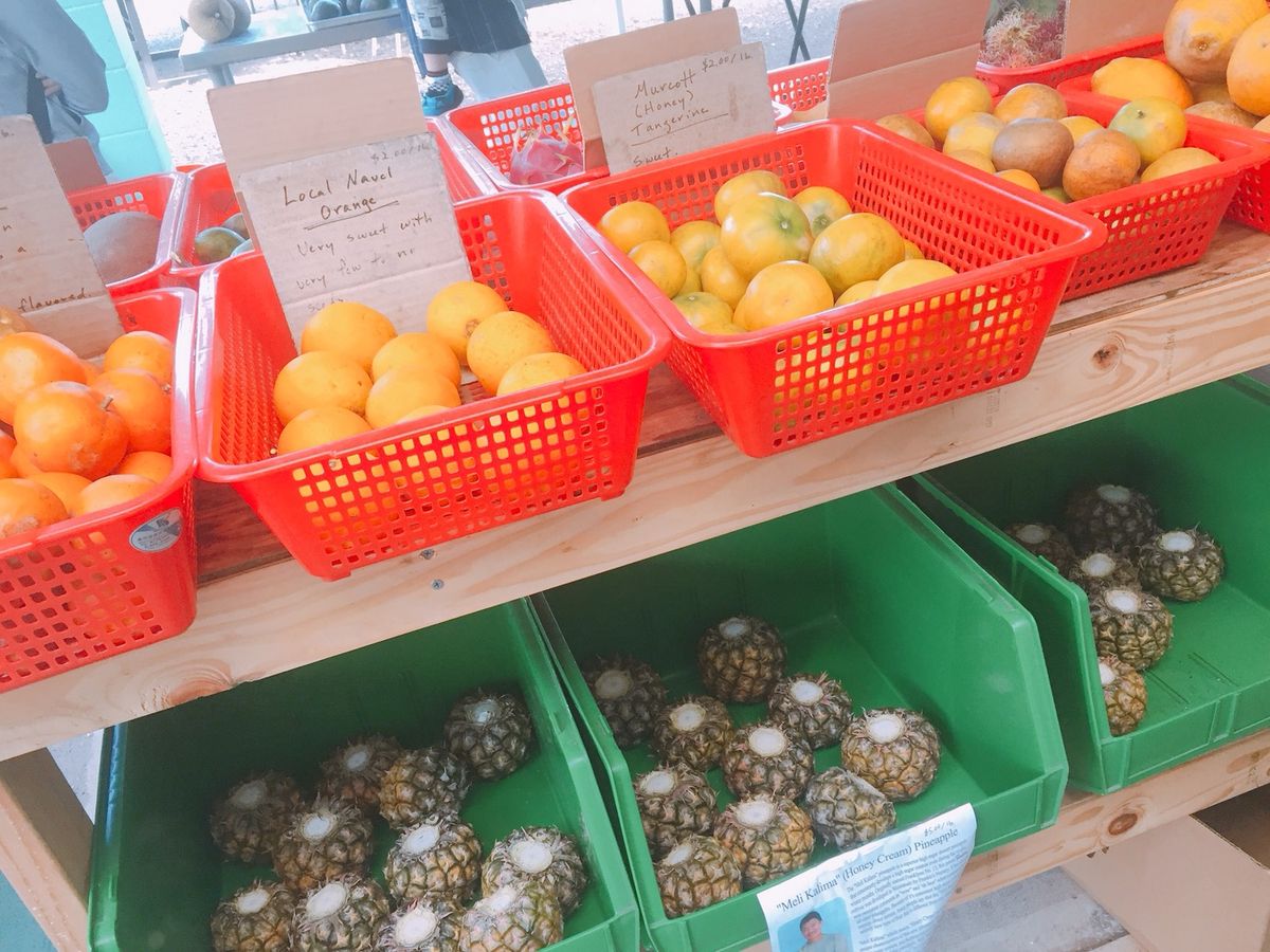 最後はテーブルに腰掛けてのご馳走タイム。 いただいたものの8割は初めてのフルーツでした。 知っているアボカドや柑橘類も甘くて美味しかったです。 念願のハニーパイナップルも甘くて美味しかった! お留守番の夫のお土産に購入しました。