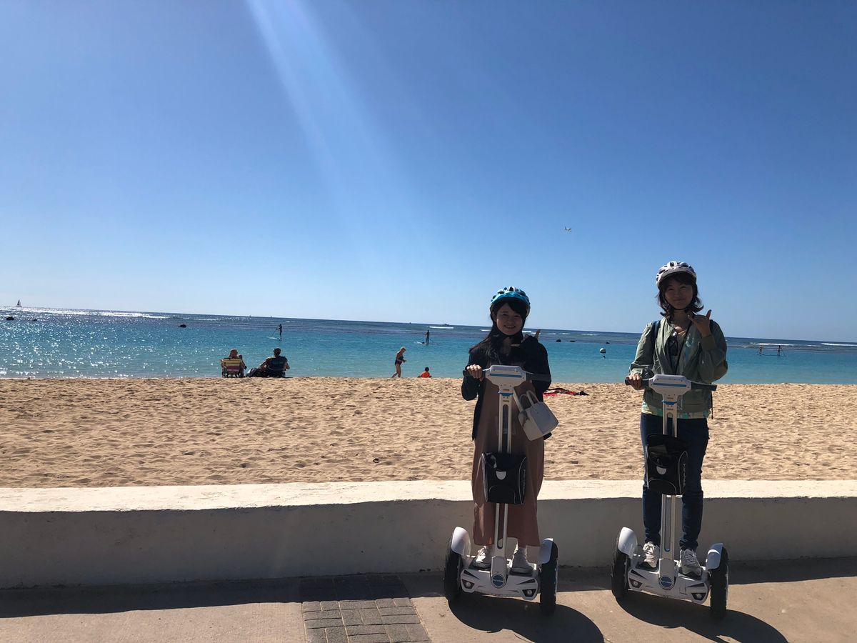 はじめは上手く乗れるかドキドキでしたが、インストラクターの方が丁寧に教えてくださったのですぐに慣れました。まずはアラモアナビーチパークへ向かう運河沿いの道に。とても広い歩道でしたので安全に走ることができ、インストラクターさんが動画をとってくださいました。次にアラモアナビーチパークへ。雲一つないワイキキの空の下はとても爽快♪ビーチコースで申し込んだのですが、ほかの参加者と同じランチ付きコースにアップデートしてくださり、おいしいホットドックをいただきました。途中、アートな壁画の前でも写真をとることができ、楽しい乗り物で快適に観光できました。セグウェイをほかの場所で見かけたのですが、それに比べてエアーウィールはとても静かでコンパクトで操作しやすく、狭い歩道でもらくらく通ることができる印象です。