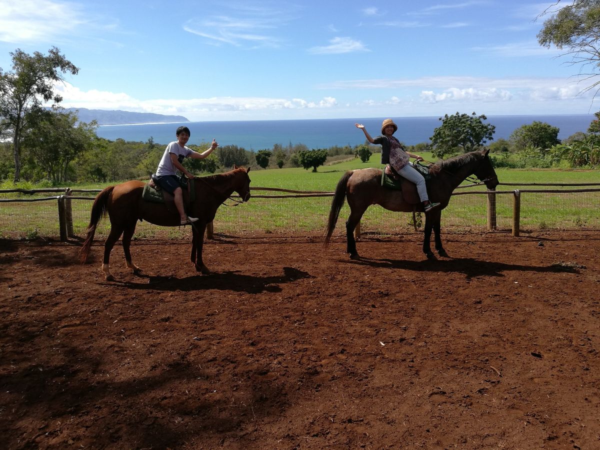 妻に誘われて申し込みました.最初は,ハワイで乗馬?と思っていましたが,起伏に富んだコースを馬に乗ってめぐるのは予想外の楽しい体験でした.40-50分?あっという間でした.もともとがポロ競技の馬とのことで,とてもよくしつけられており,小さいお子さんんも楽しそうに乗っていました.楽しい経験になること請け合いです.