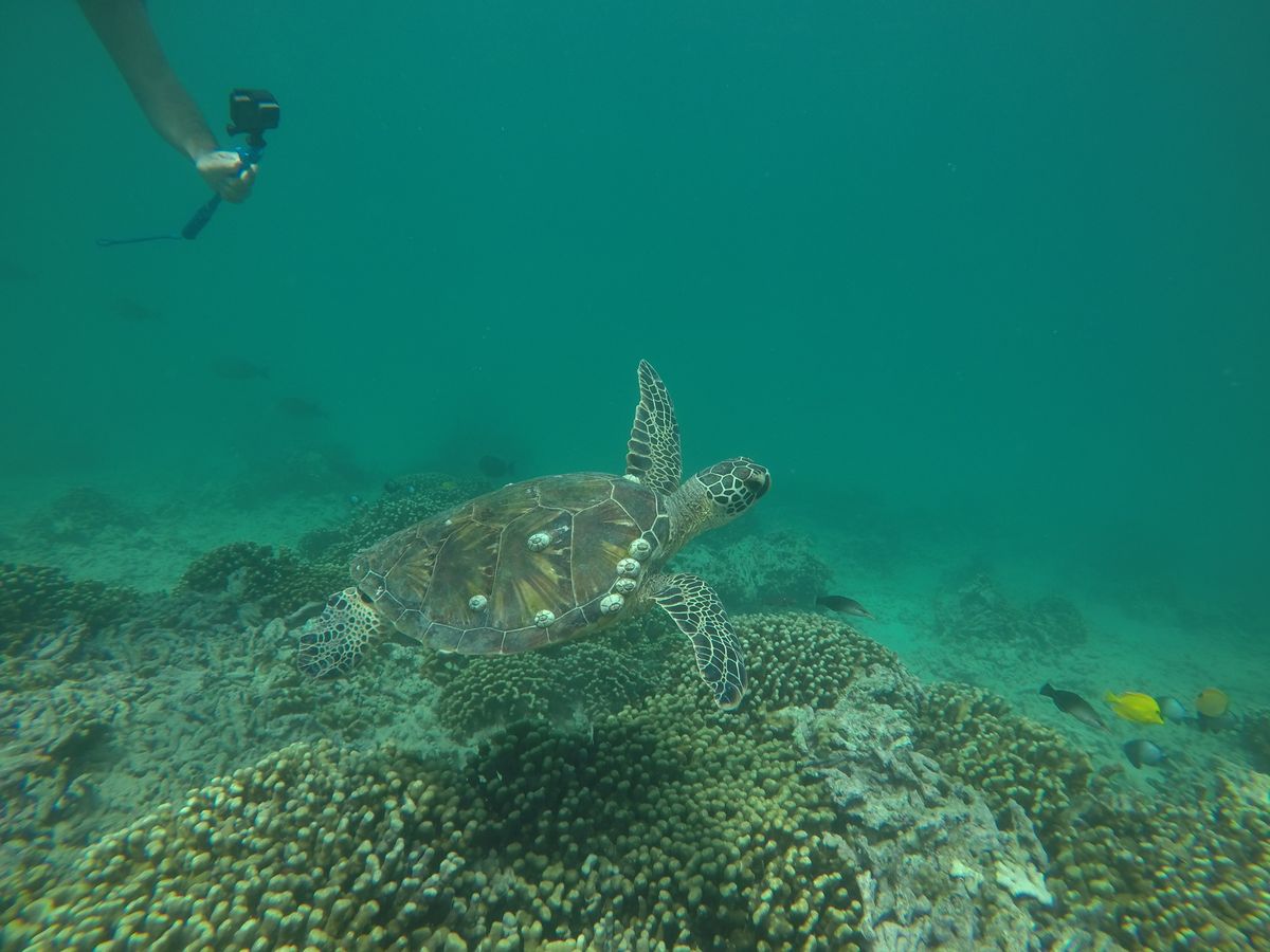 当日はあいにくの曇模様で下が、エイやウミガメがたくさん見えたのは良かったです。シュノーケリングの時にはサンゴのくぼみで休んでいたウミガメがいて、息つぎに浮上して来たところで甲羅にタッチすることができました。体長60cmはあろうかというミドリウミガメの甲羅にはフジツボが何個かついていて年齢を重ねていると貫禄がありました。