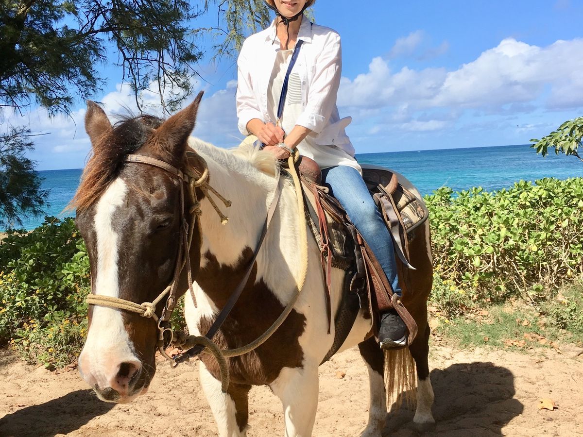 朝、8:25にピックアップでしたが、同行するはずの娘が体調不良になり、1人での参加となりました。まずは、15年ぶり?に、ドールパイナップルプランテーションで30分フラフラ。ハイレアに向かう前にホヌさん(亀さん)いるかも知れない海岸へ、残念ながら息継ぎをするホヌさんしか見えませんでしたが、近距離での遭遇。なんだか、ワクワクしました。さて、ハイレアでは、ガーリックシュリンプを食べる予定でしたが、1人では無理なので、アサイーボウルに変更。言わずと知れた美味しさ。そして、いよいよ今回のイベント乗馬体験です。慣れたお馬さんはお利口でおとなしく、途中、お腹すいている時間だったらしく、横の草をむしゃむしゃ。しかし、GOサインを出すと、ゆっくり歩き出します。充実した45分の乗馬体験でした。行き帰り共、海岸にいる、ホヌさんを車上から確認しました。道が空いていたので帰路にもハイレアで時間を取ってくださいました。夕方までとても良い体験ができました。