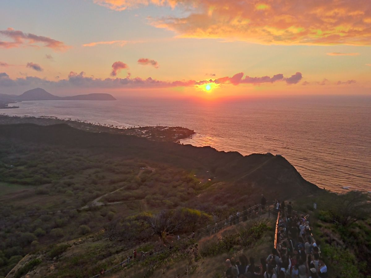 3連休の最終日に当たる日のせいか、それとも毎日そうなのかわからないけど日本人がめちゃくちゃ多かったです。帰国当日でも参加出来るのが魅力で参加しました。頂上は人が多くてちょっと大変でした。下山するとレイを借りて記念写真を撮ってもらえるのですが出発時間ギリギリでひやひやしながらの記念写真となりました。