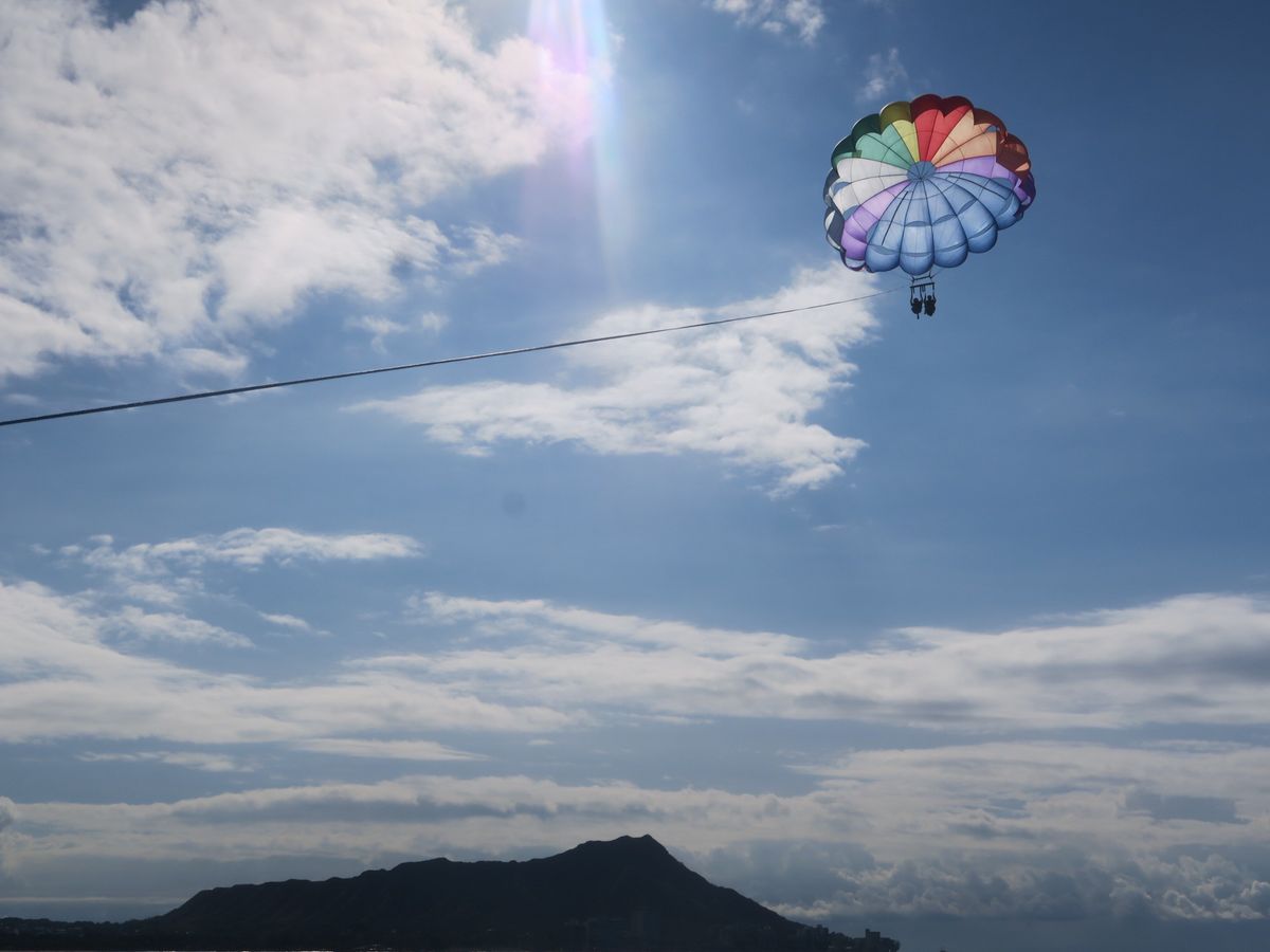 ダイヤモンドヘッドを眺めながら気持ちの良い朝の空中散歩ができました。パラセーリングを引っ張る船はかなり揺れますが、気持ち悪くなったりということはありませんでした。最後降りてくる前に水に落ちるので、飛ぶときは濡れて良い格好で、濡れて困るものは外しておく必要があります。(船の座席の下に荷物をおくスペースがあります。)ホテルまでは濡れたままで帰れるので着替えをもっていく必要はありませんが、チップの用意は必要です。