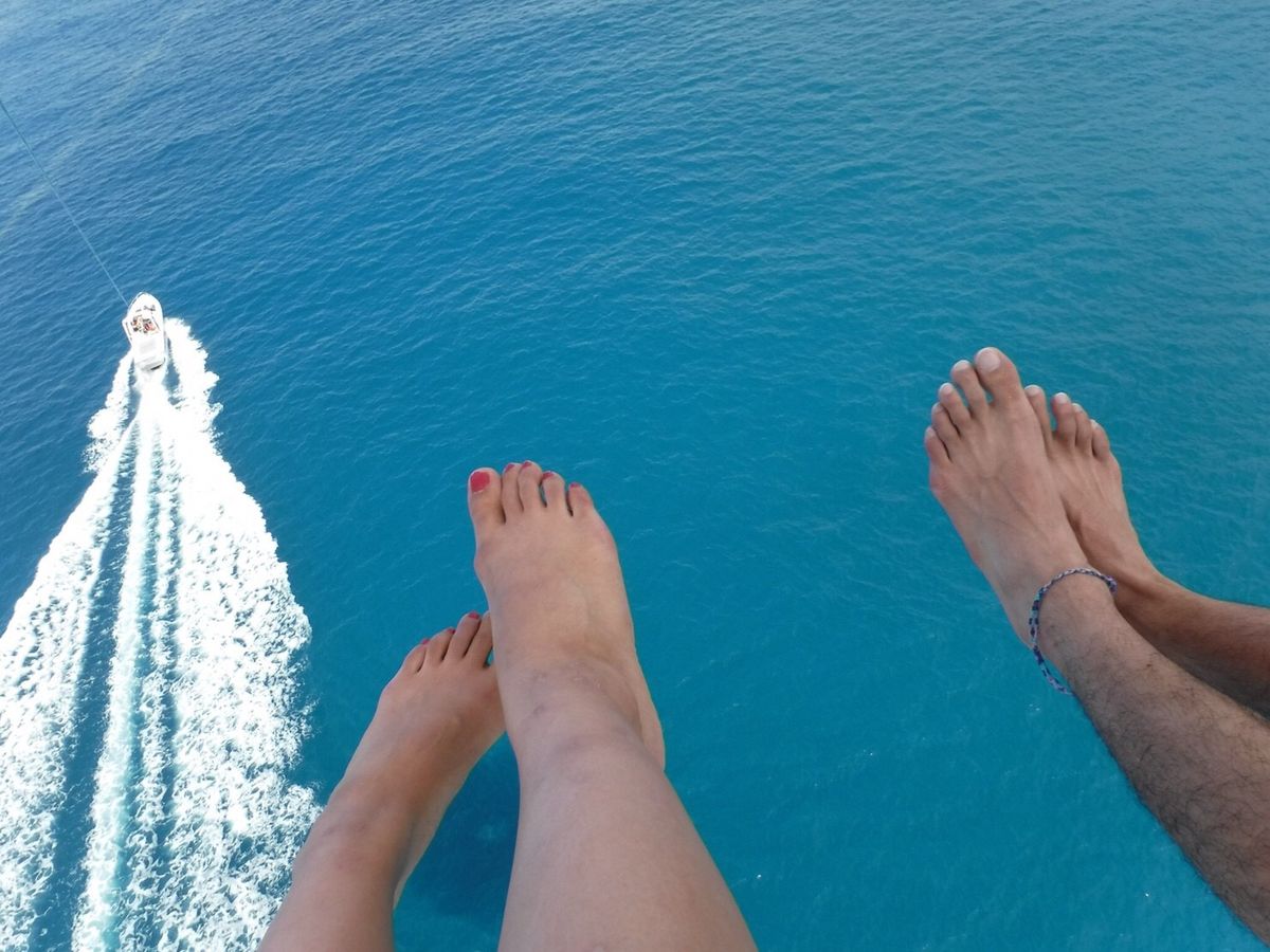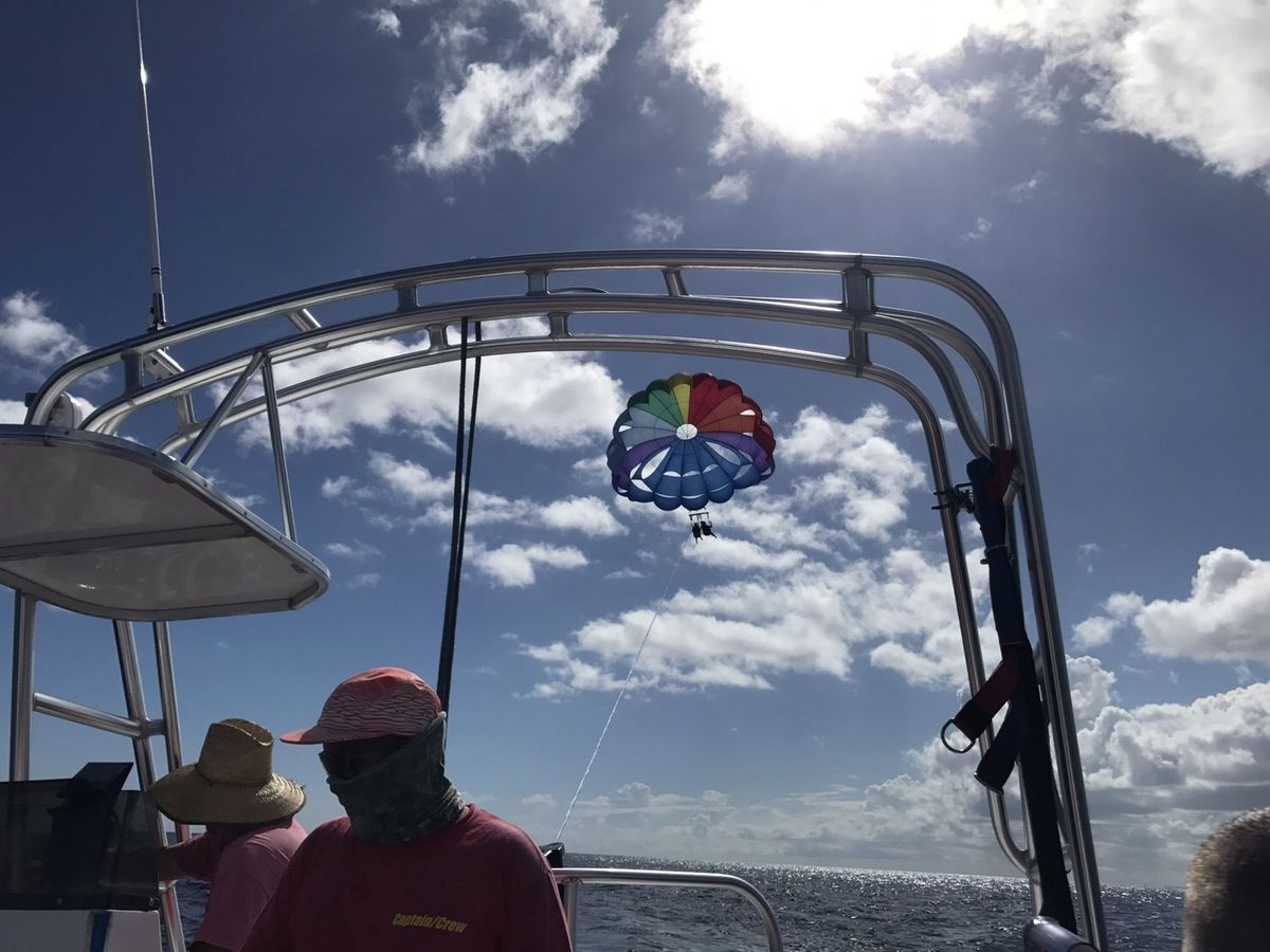 こちらの会社は英語のみです。船でかなり沖まで行くのですが私は酔いました。大丈夫と思ってても酔い止めを飲むことをオススメします。本当に揺れますし参加者が多い場合ずっと船の上なのでキツイです。それでも無事パラセーリングは出来ました!ハネムーンということを事前に伝えていたので何回も着水サービスがありました…他の参加者に比べて私達夫婦は全身びしょ濡れになりました笑 写真を頼むと面白い写真いっぱい撮ってくれます。$30でSDカードでデータくれます。スタッフさんにチップをあげるタイミングもありましたが持ち合わせが$30しかなく払えませんでした。ごめんなさい。。それぞれどの高さで申し込んでいたのかわかりませんがかなり高い位置まで飛びました。正直スタッフさんがどのグループがどの高さで申し込んでいるのか把握してない気がします。高いとこ大丈夫で着水スリルを楽しみたい方はぜひ体験してみてください!