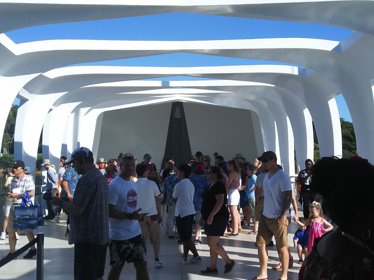 かなり早朝からスタートでしたが、アリゾナ記念館に到着した時には既に長蛇の列で、まずは荷物を預け(1個$4.00)構内へ入場。7:45にアリゾナ記念館に渡し船で渡って見学。
