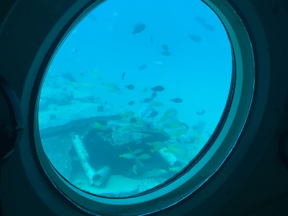沈むと海の中は濁っておりあまり魚が見えませんでした。人工的に沈められた餌場の周りには魚がいます。ホームページなどの写真が綺麗すぎるのでそのイメージでいたのでがっかりです。また、潜水艦の中はヘッドホンで説明を聞くだけで乗務員さんからの話はほとんど無いのでそれも少し残念です。小学生くらいの子供は楽しんでいました。