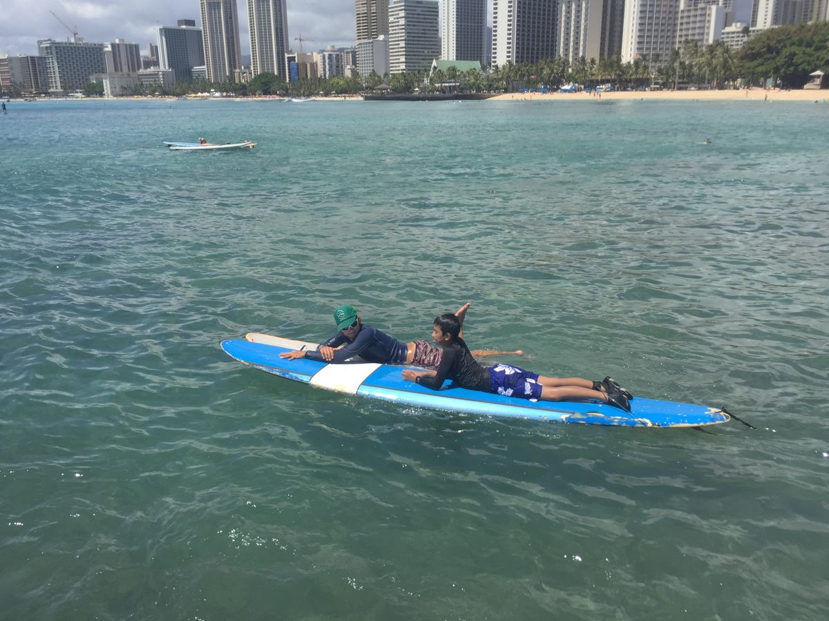 ワイキキビーチのど真ん中で波に乗るということを初めて体験でき、みんな大喜びでした。