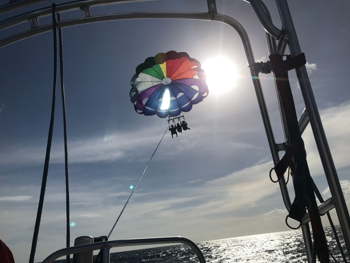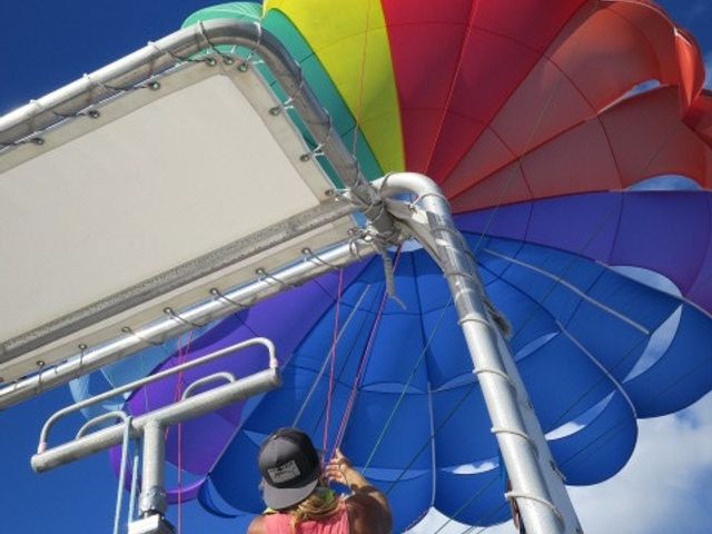 事故もあると日本の旅行会社から聞いてたので、実は心配していましたが、ヒルトンのすぐそばから船が出て、酔う間も無くもう1組目のスタートという感じでした。私の時は日本人の方だけの3組でした。見学だけで自分で写真を撮ってるご家族の方もいました。10歳の子どももとても楽しめました。不安だった着水もなく、船に上手に降ろしてもらえたので洋服でも良かったくらい最初から最後まで何も濡れませんでした。手に800のシールを貼られたので、たしか120mに申し込んだかと思いますが800フィート?想像以上の高さでゆったりと流れる風と素敵な景色を存分楽しめました!写真のSDカード代(自分じゃ撮れないショットも多いです!)35ドルと、カタコトの日本語で説明してくれた船のスタッフさんへチップのご用意を(o^^o) 酔い止めの飴舐めましたが、他の方のを待ってる間に少しだけ息子は酔ったそうです。