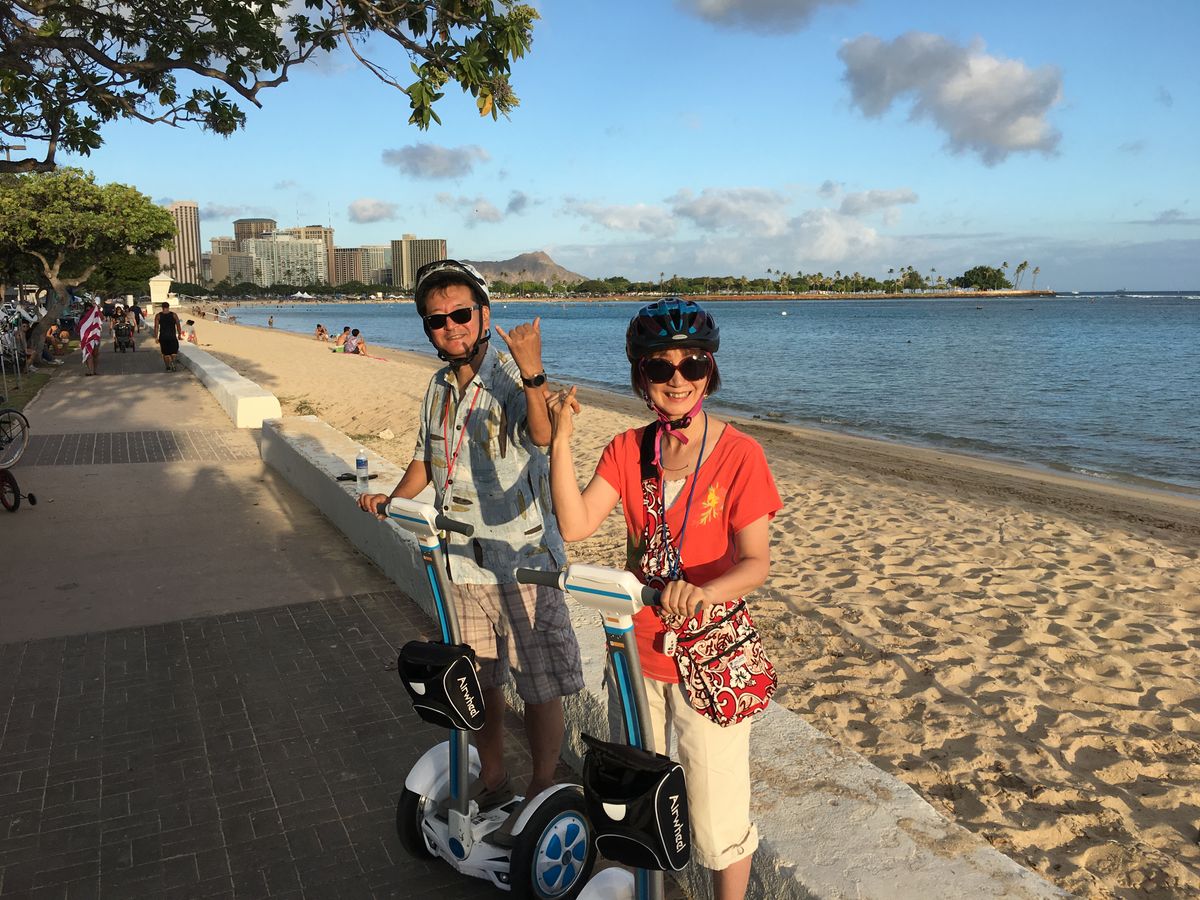 セグウェイにハワイで乗れると申し込みました。集団でゾロゾロと走行するのかなと思っていたら、当日は私たち二人だけの参加となりマンツーマンで教えていただけたり、写真やビデオを専属で撮っていただけたりしました。また、街中でも要所要所で安全配慮していただき、衝突や転倒などもなく、運河沿いやアラモアナ海岸をスイスイとお散歩できました。天候にも恵まれ、ダイヤモンドヘッドやワイキキの街を背景に撮っていただいた写真は何よりのお土産になりました。