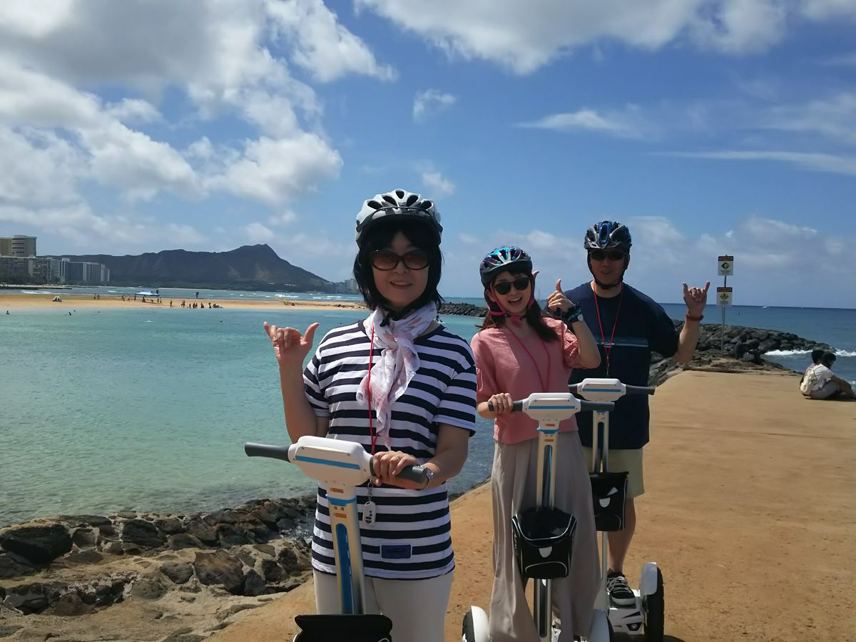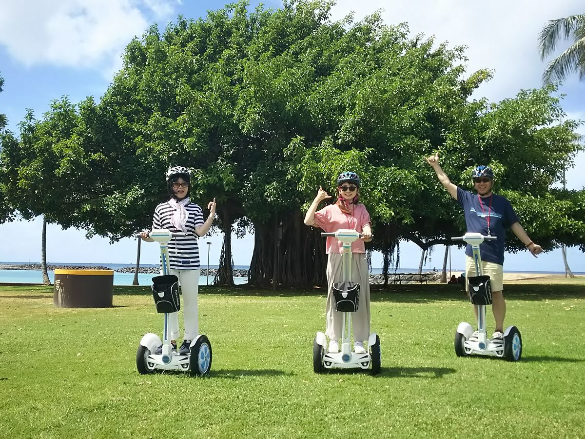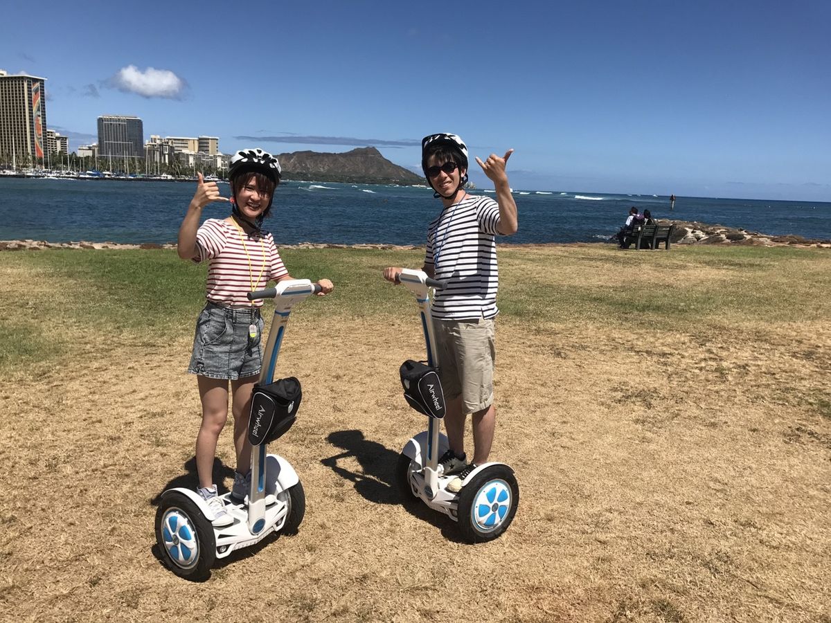 エアーウィールは、体重移動とハンドル操作だけで簡単にすぐに乗れるようになります。サンセット前のビーチ沿いを風を切りながら走るのはめっちゃ最高でした。スタッフの方がとても親切で、段差や気をつけた方が良い箇所がある時は、その都度声かけをしてくれるし、写真や動画も撮ってくれるからちゃんと思い出も残せるし、自由時間は公園の中を思いっきり走り回れます。次にハワイに行く時もまた参加したいです。