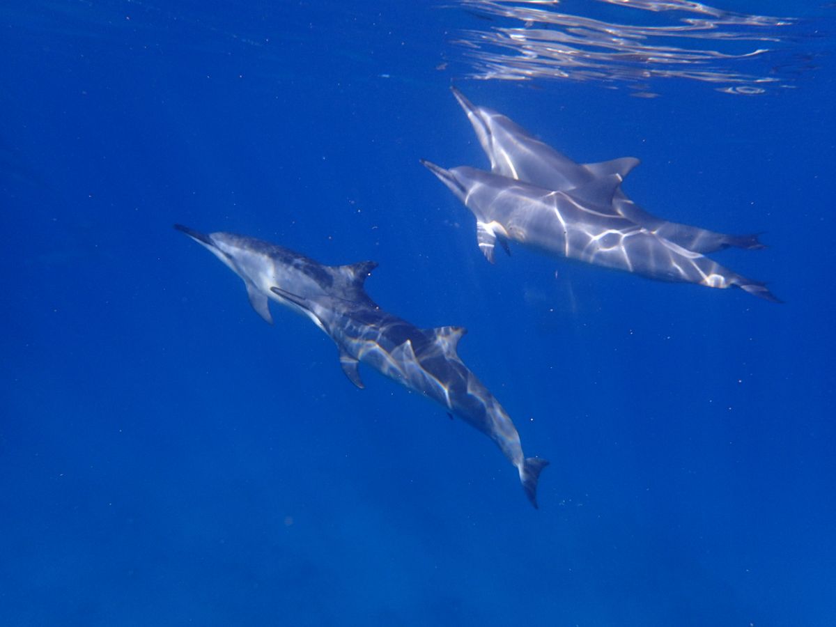 イルカは出港してから15分ほどで、30頭ほどの群に会えました。海も穏やかで、イルカたちものんびり泳いでくれたので、水中写真も撮りやすく、本当に楽しかったです。