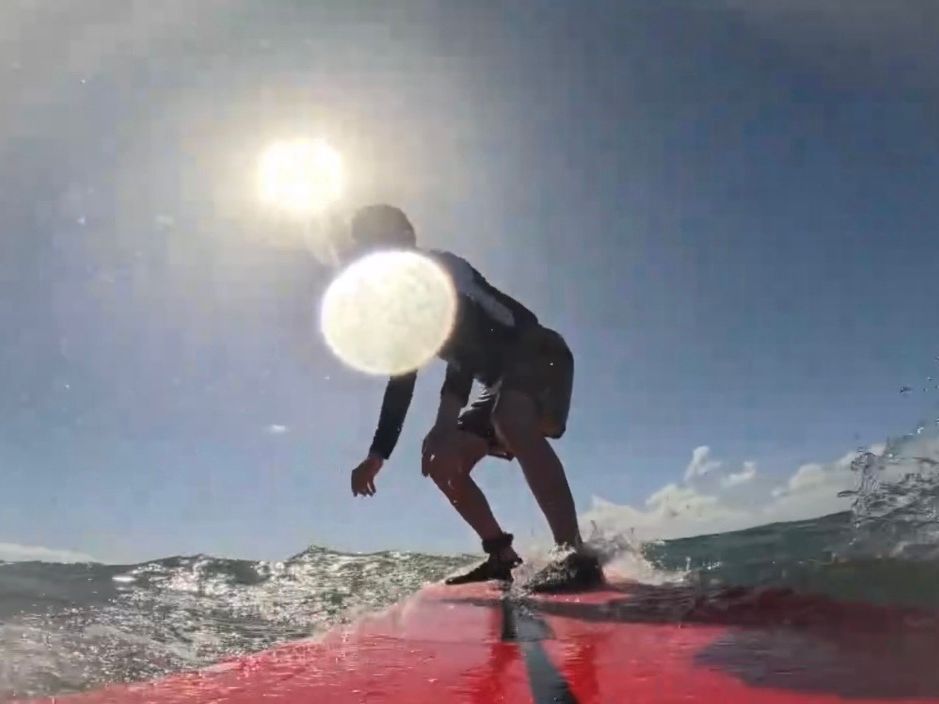 先生にサポートされながらちゃんとサーフボードで波乗りができて感動しました。