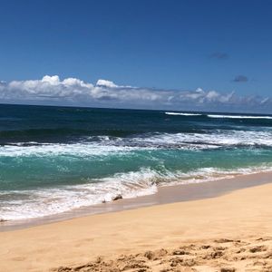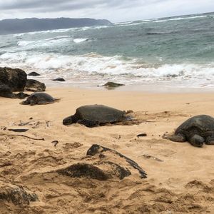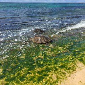 今までのハワイ旅行では土曜日に帰路につくことばかりでしたので、今回が土曜日限定のKCCファーマーズマーケット&ノースショア散策付きカウカウツアーに参加したのは初めてでした。KCCファーマーズマーケットでは突然の激しい雨に見舞われ、楽しみの時間が半減してしまいましたが、お目当のアワビの塩焼きを食べることができました。レナーズのマラサダ、マカデミアンナッツの試食、ガーリックシュリンプ、松本シェーブアイスでレインボーアイス、ドールプランテーションでパイナップルアイスクリームといろいろなグルメを楽しむことができました。さらに砂浜では3匹のウミガメ、海中で泳いでいるウミガメにも出会うことができました。機会があれば次回もぜひ利用したいです。