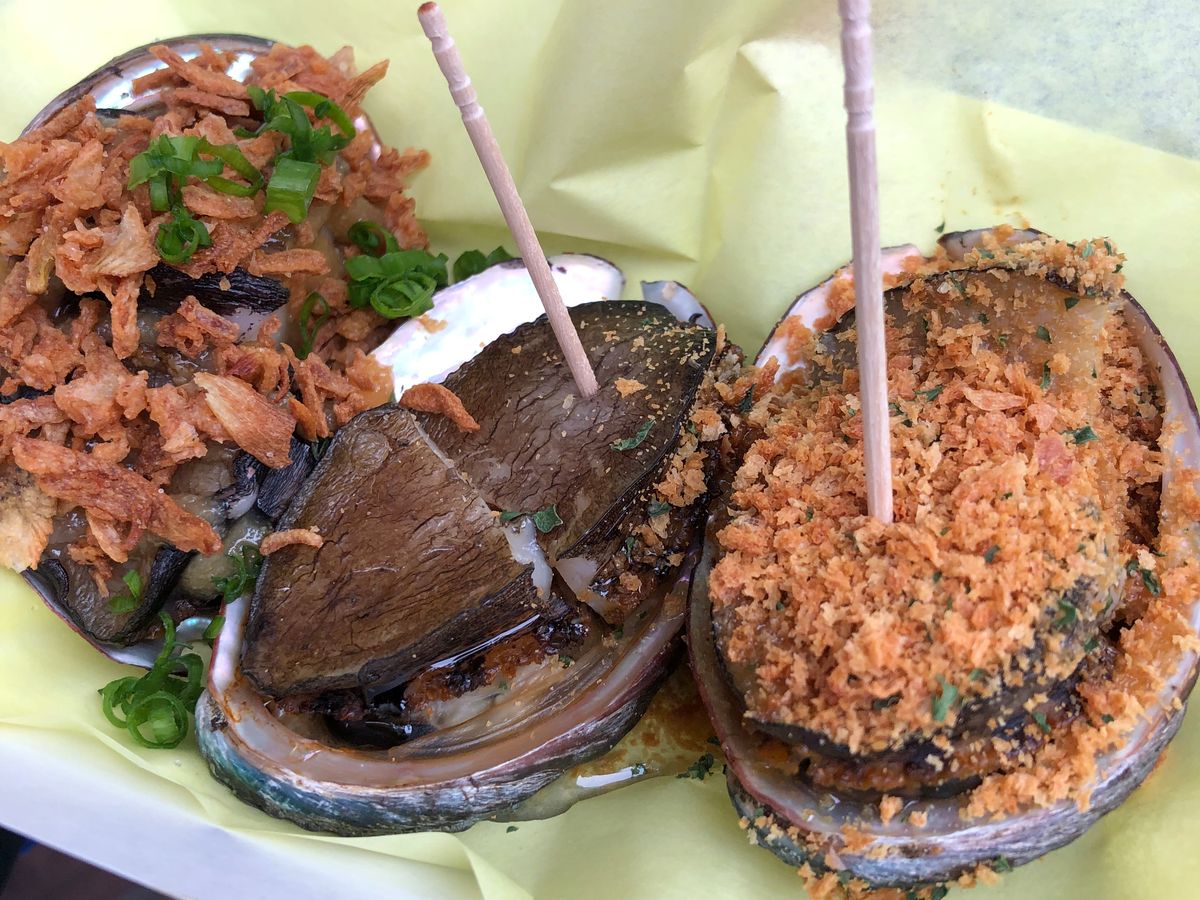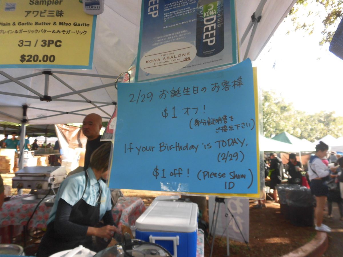 2/29の誕生日にオアフ島一周を計画。土曜日だけのファーマーズマーケットへ。親切なガイドさんの「これから沢山食べるので食べ過ぎないように」との注意を守りながら、まずはアワビのにんにく焼き。ここだけ「2/29誕生日の方割引」と表示してあり、1ドルサービス。1ドルとはいえ嬉しかった。2/29生れは4年に一度でそうそういない。多分私一人と満足感にひたりました。