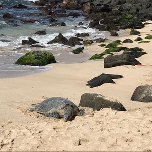 ツアーは12名で出発しました。最初はKCCファーマーズマーケットです。良いお天気でマーケットの雰囲気もとてもよく満喫しました。レナーズのマラサダの本店に連れて行ってもらい、並ばずにできたてのマラサダをいただきました。マカデミアンナッツファームもワイキキでは売っていない色々な味のナッツを試食できて良かったです。次の目的地に向かう時から少し雨が降ってきて、綺麗なビーチでぎりぎり写真は撮れましたが、次のガーリックシュリンプのローミーズにつく頃には豪雨のような天候に見舞われました。食事をしている間は心配でしたが、添乗員さんが傘を用意してくれたり、車を近くまで持ってきてくれたり優しい気遣いをしてくれました。ウミガメビーチに着いたころにはすっかり雨も上がり、ウミガメも見れて良かったです。ハレイワの自由時間もちょうどよく、雨の時はどうなることかと心配しましたが、移動中の天候の悪さだけで結果的には大満足のツアーでした。