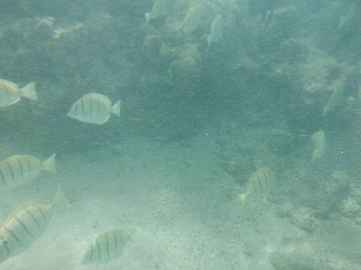 ハナウマ湾の状態は波が少しある方でしたので、泳いでも少し戻されていったり、反対に流れとともに進んだりするような感じで潜っていきました。最初はシュノーケリングの呼吸のしかたになれること、フィンを初めて使ったので、動かすことに夢中でしたが、そのうちお魚たちが見えてくるようになり、もっとよく見たいと思えるようになってきました♬