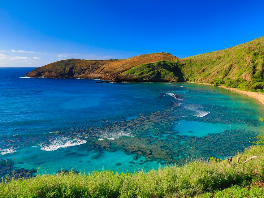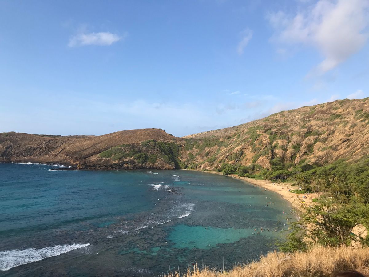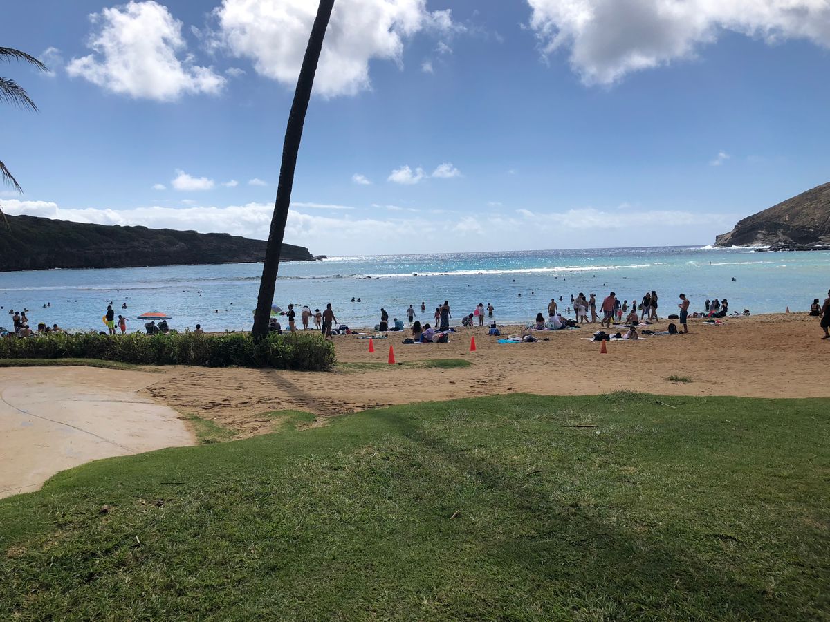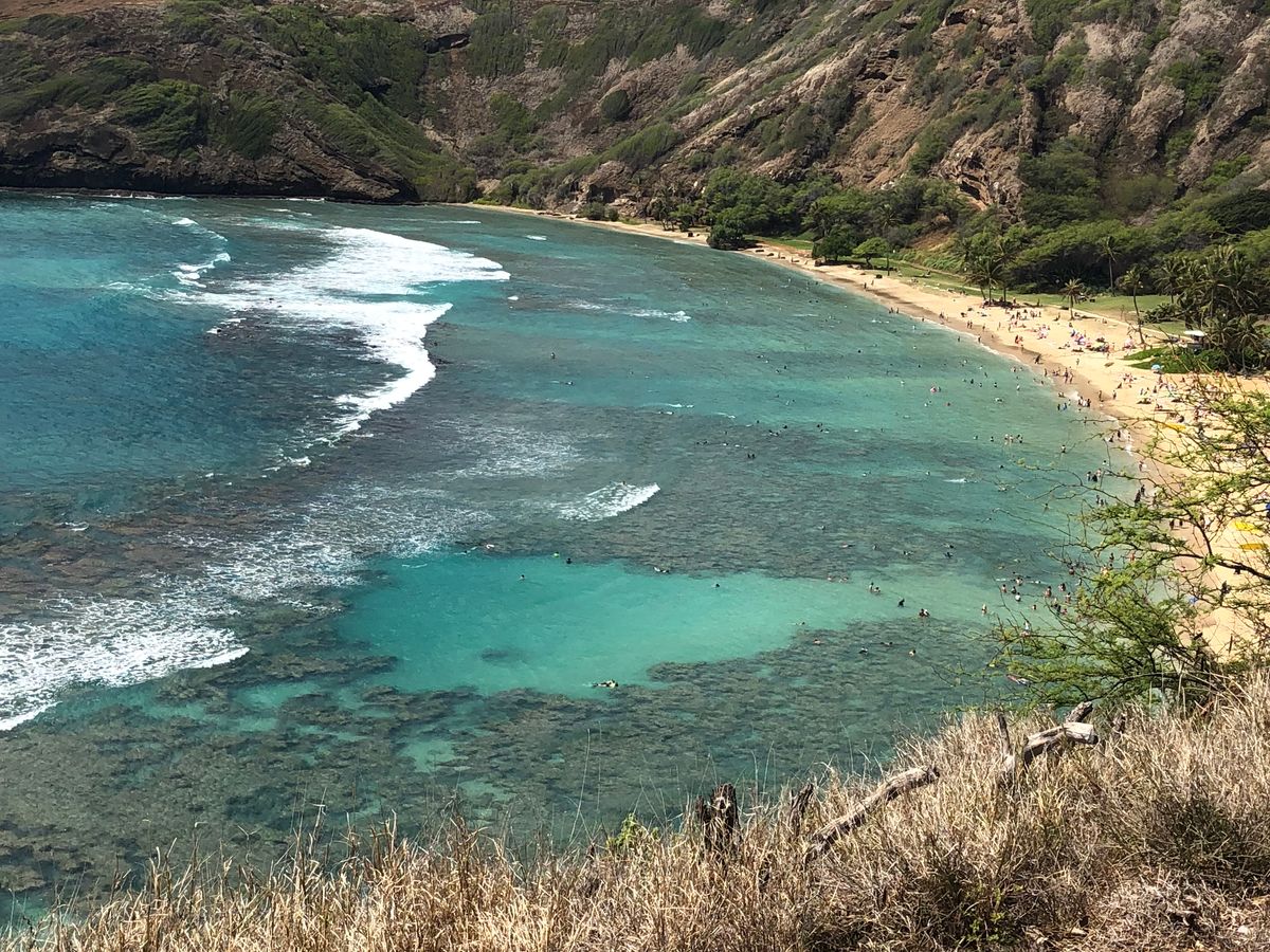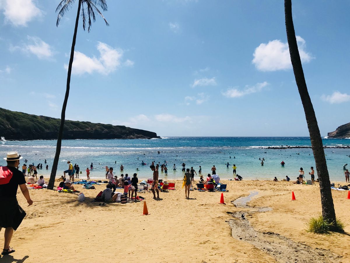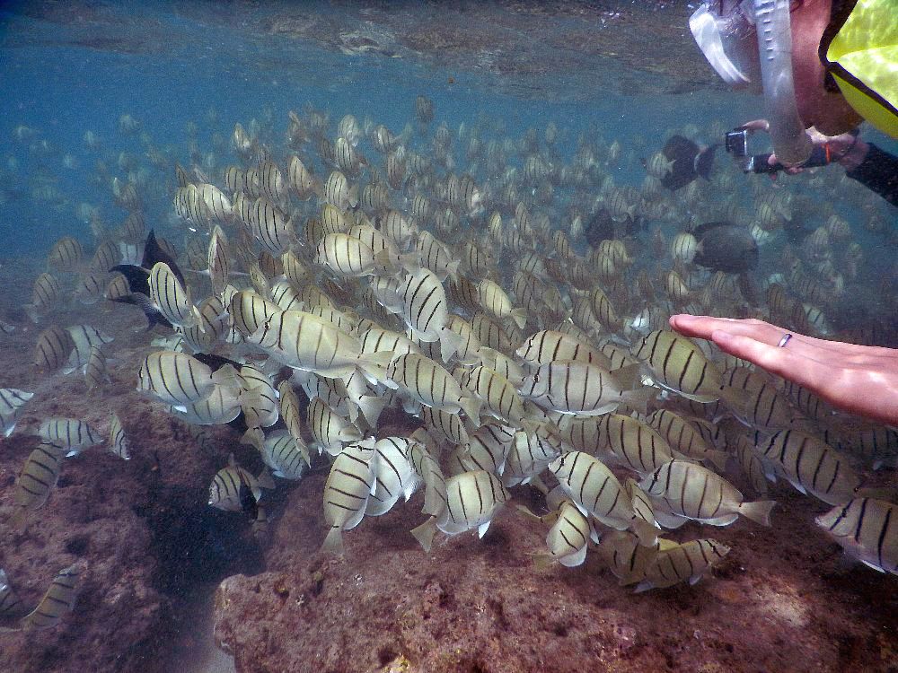 早朝7時のホテルピックアップでNo.1ベストビーチにも選ばれたハナウマ湾に。元々火口だったところが落ち込んでできた遠浅の海に魚がいっぱい。