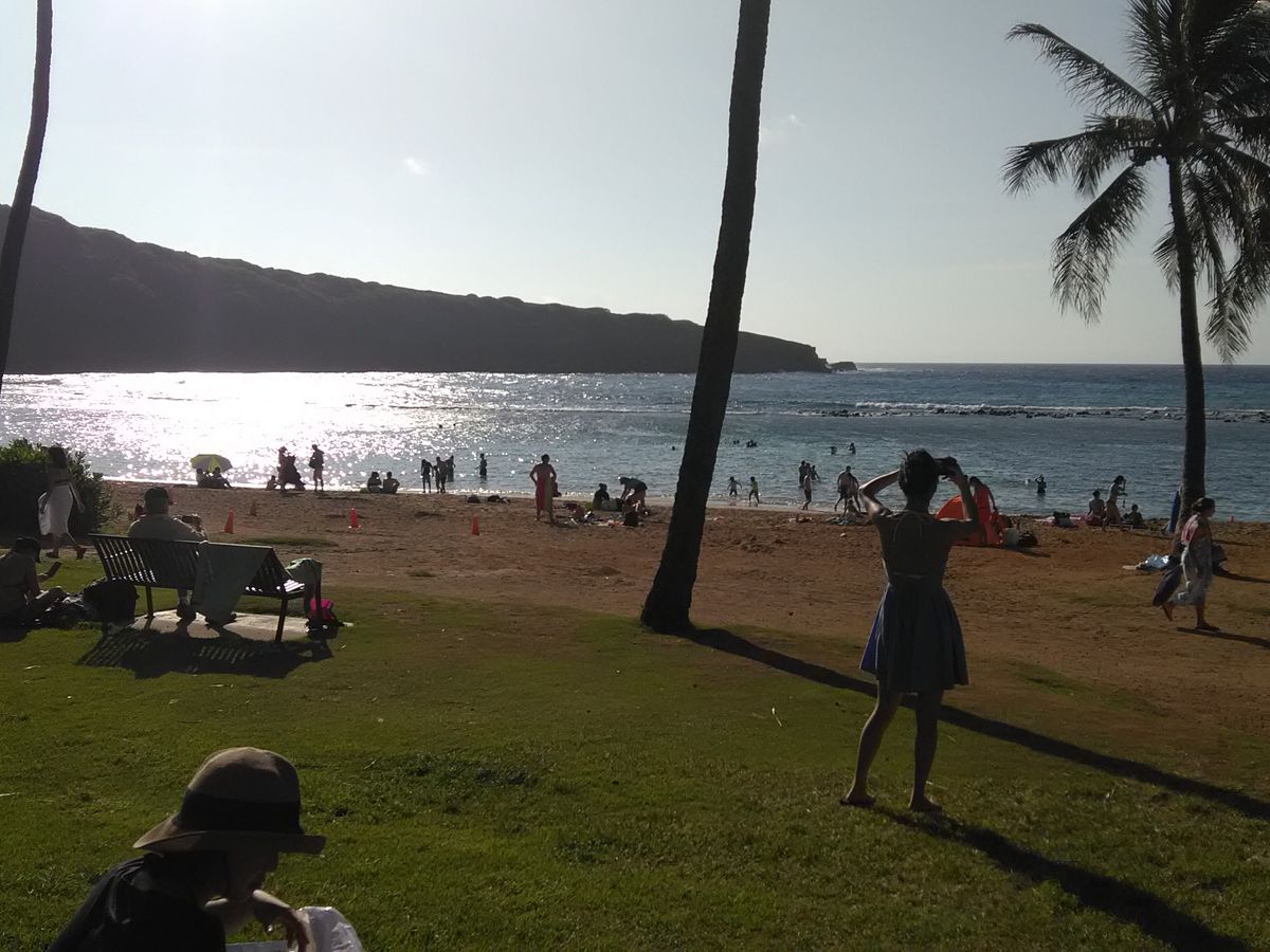 いつもは上から眺めていたハナウマベイでしたが、今回はシュノーケルをするためにシャトルで降りていきました。 どんな魚たちに会えるかな? 以前少しシュノーケルを体験したことがありましたが、足ヒレをつける本格的なのは初めてです。インストラクターのちえ子さんとダンさんがシュノーケルの仕方を要領よく教えてくださるので、頭ではよく分かりました。 う~ん、実践では… 方向転換の仕方、メガネの中に入った水の抜き方、ヒレの動かし方など慣れるのには少しかかりましたが、次々、水中に現れる魚たちに励まされながら、たっぷりシュノーケルを楽しむことができました。最後の方で、ダンさんがウミガメを見つけてくださいました。のんびりとお食事中のようでした。食後は、私のすぐ近くを、恐れもせず悠々と泳いで行きました。こんなに近くでウミガメが見られるなんて…驚きと感激でした。このツアーに参加してホント良かったです。一緒に参加した夫とバディーを組んだのですが、なかなか一緒に泳ぐことができず、ずっとちえ子さんに手を引いていただくことになりました。お世話になりました。お陰様で、安心してシュノーケルを楽しむことができました。また、シュノーケルをしたくなったら絶対このツアーに参加します。有難うございました。