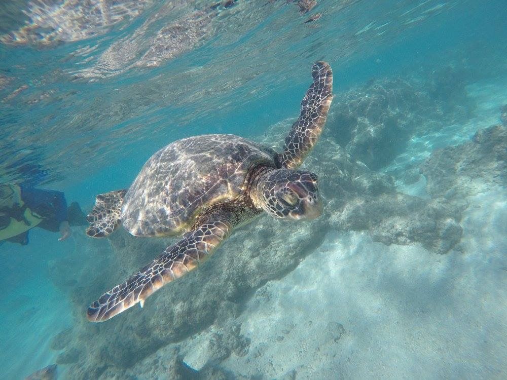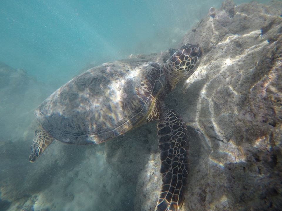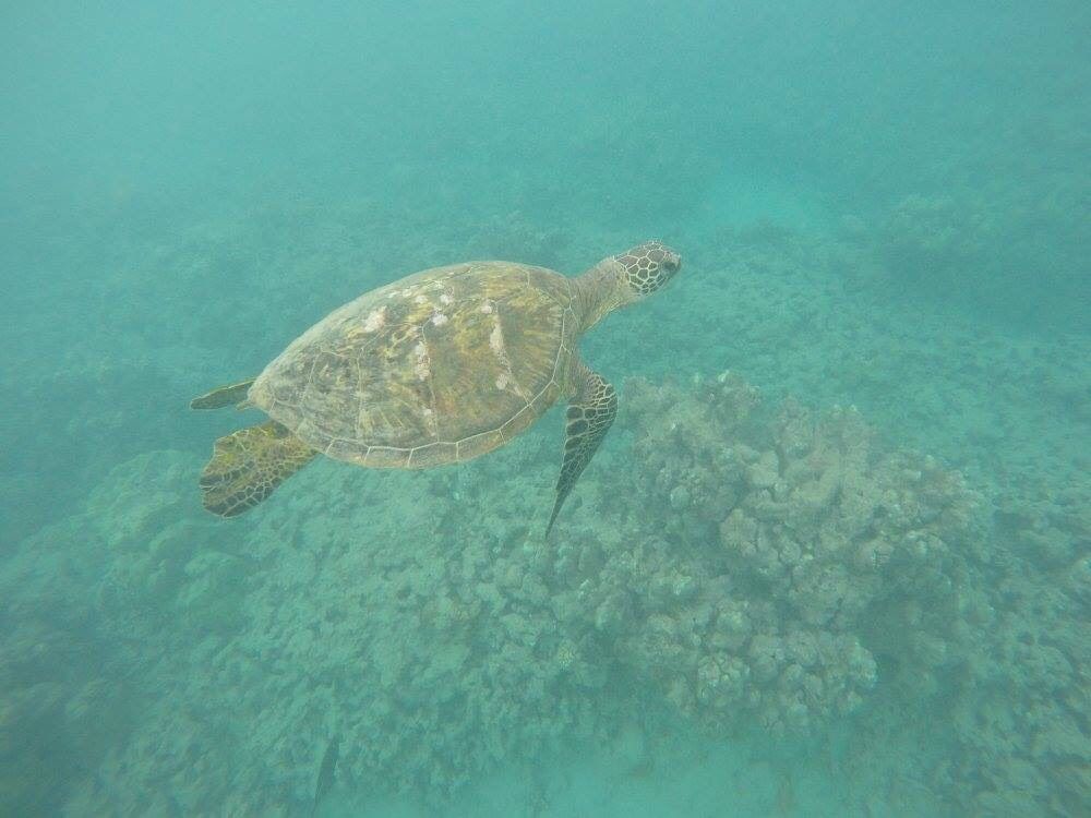 ハワイはずーっと雨が降って居て、この日にやっと晴れてくれました。寒いしウミガメに会える確率は低いよー。と言われ、いろんなお魚に出会えるだけでいっか。なんて家族で断念していましたが、奇跡的に1匹だけ出会うことができました。