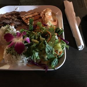 ディナーはすぐ目の前がビーチの店で生演奏で歌を歌ってました。B級グルメでワンプレートにさかなと肉とエビとサラダとご飯がのっていて特にガーリックシュリンプが美味しかったです。