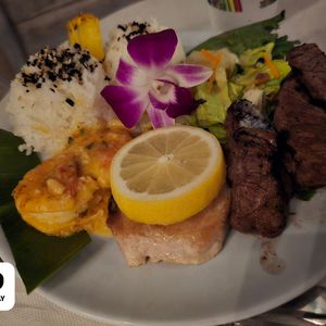 ビーチ近くで素敵なお店で ガーリックシュリンプ、アヒ、ステーキのワンプレートでハワイグルメを堪能できました。
