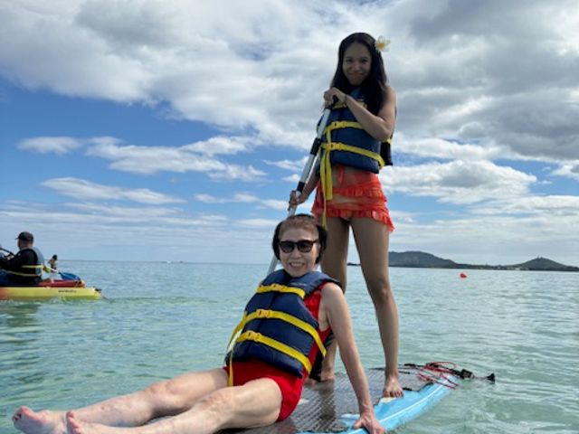 天気にも恵まれて最高に楽しいアクティビティとなりました。SUPにも挑戦しましたが、波も穏やかなのですぐに立って漕げるようになりました。