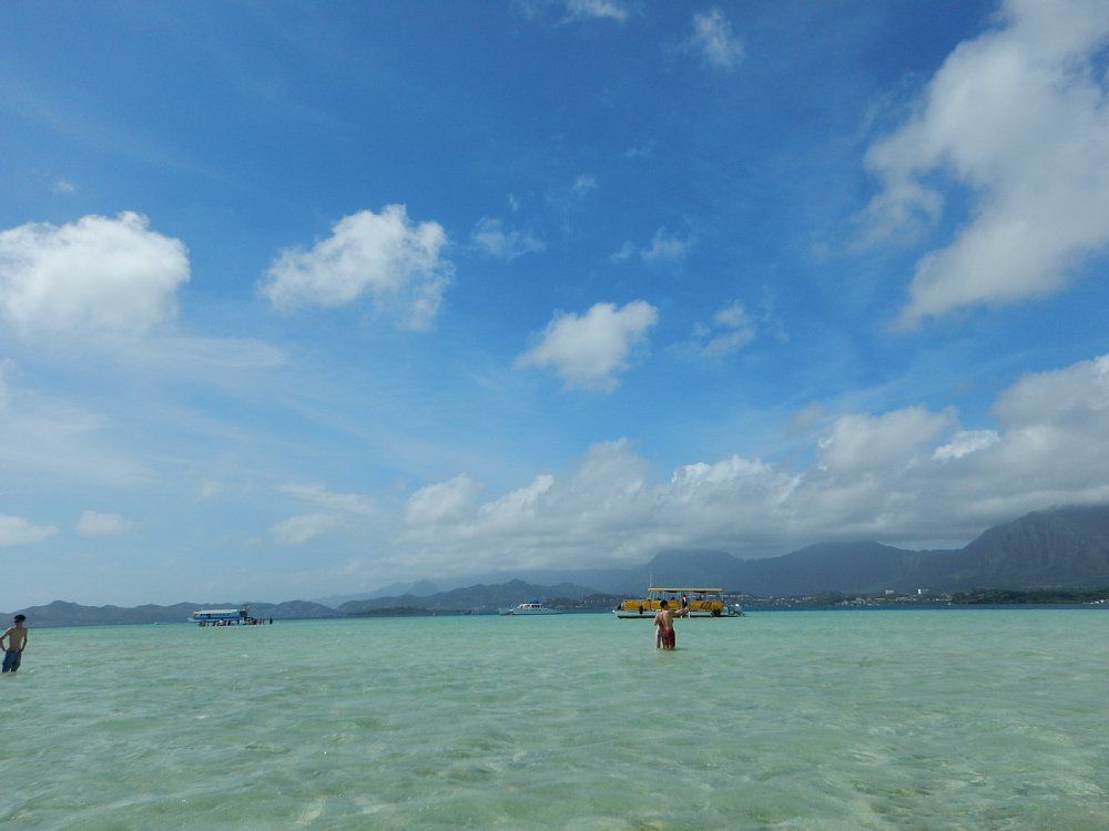 私自身、初めてのハワイで家族をつれての旅行でした。天国の海、期待して前もって潮の時間も確認してこの日にして正解でした。完全には中洲みたいな砂浜がでている状態ではありませんでしたが、膝下くらいで綺麗な砂が海面に反射してまさしく日本にはにない綺麗な海でした。子供たちも感動しておりましたが、ココでの時間は写真撮影か、バレーしかありませんでした。バレーボールはハイテンションな外人さんに占領され日本人ボートチームはただソレを見ているだけでした。ココでもっと過ごすに楽しめる物を催してくれたら、差別化がもっと出来るし、思い出も、感動も倍増するのでは・・と感じました。ゴムボート、トランポリン、水球、水鉄砲、エトセトラ・・・