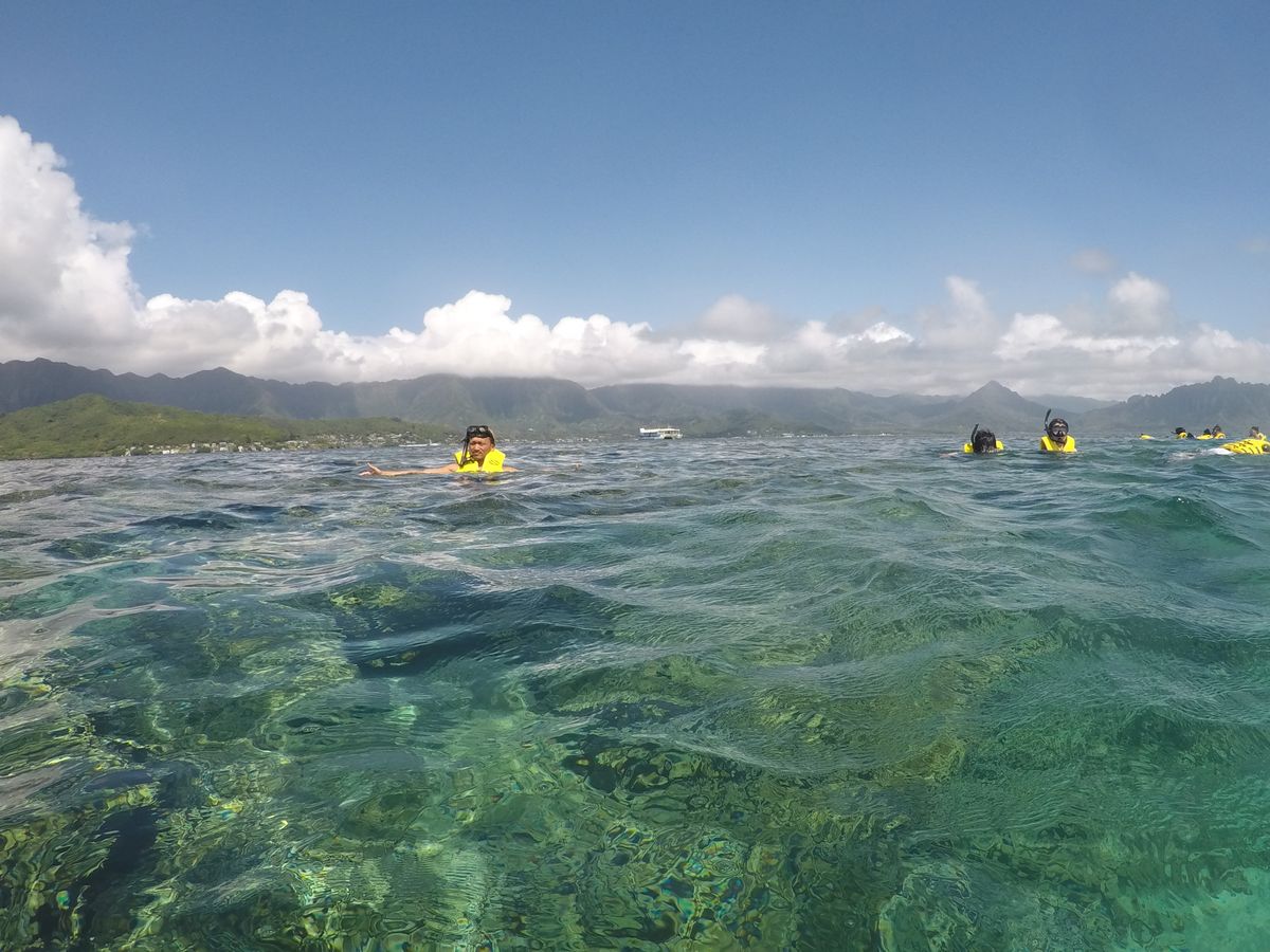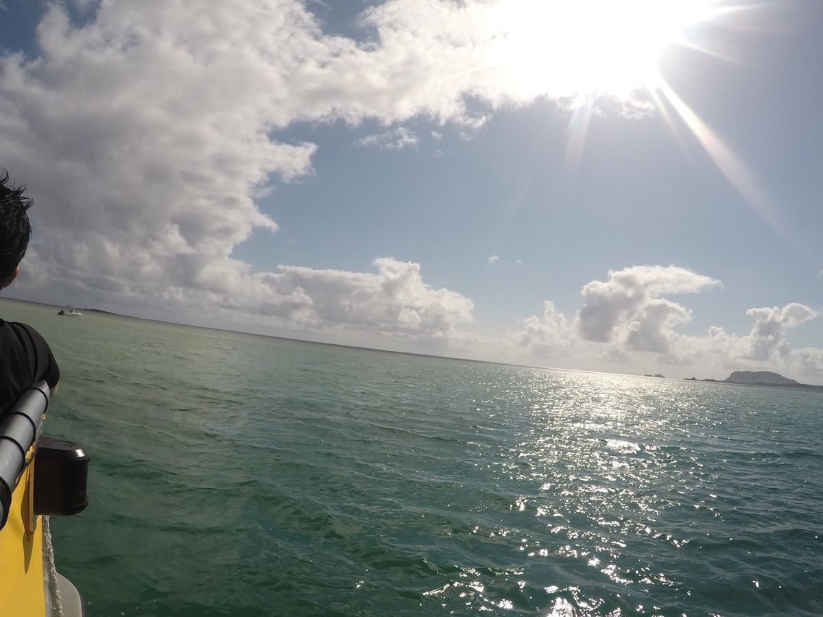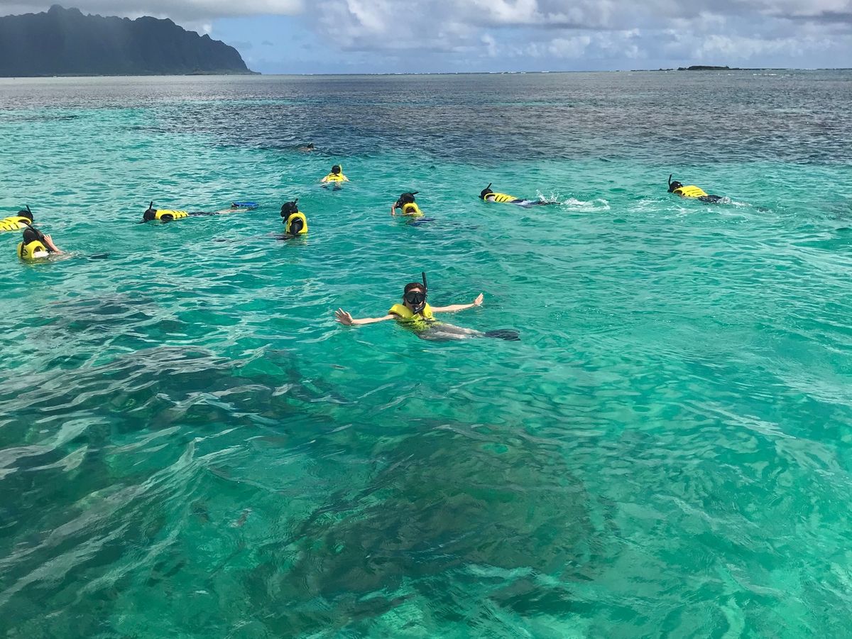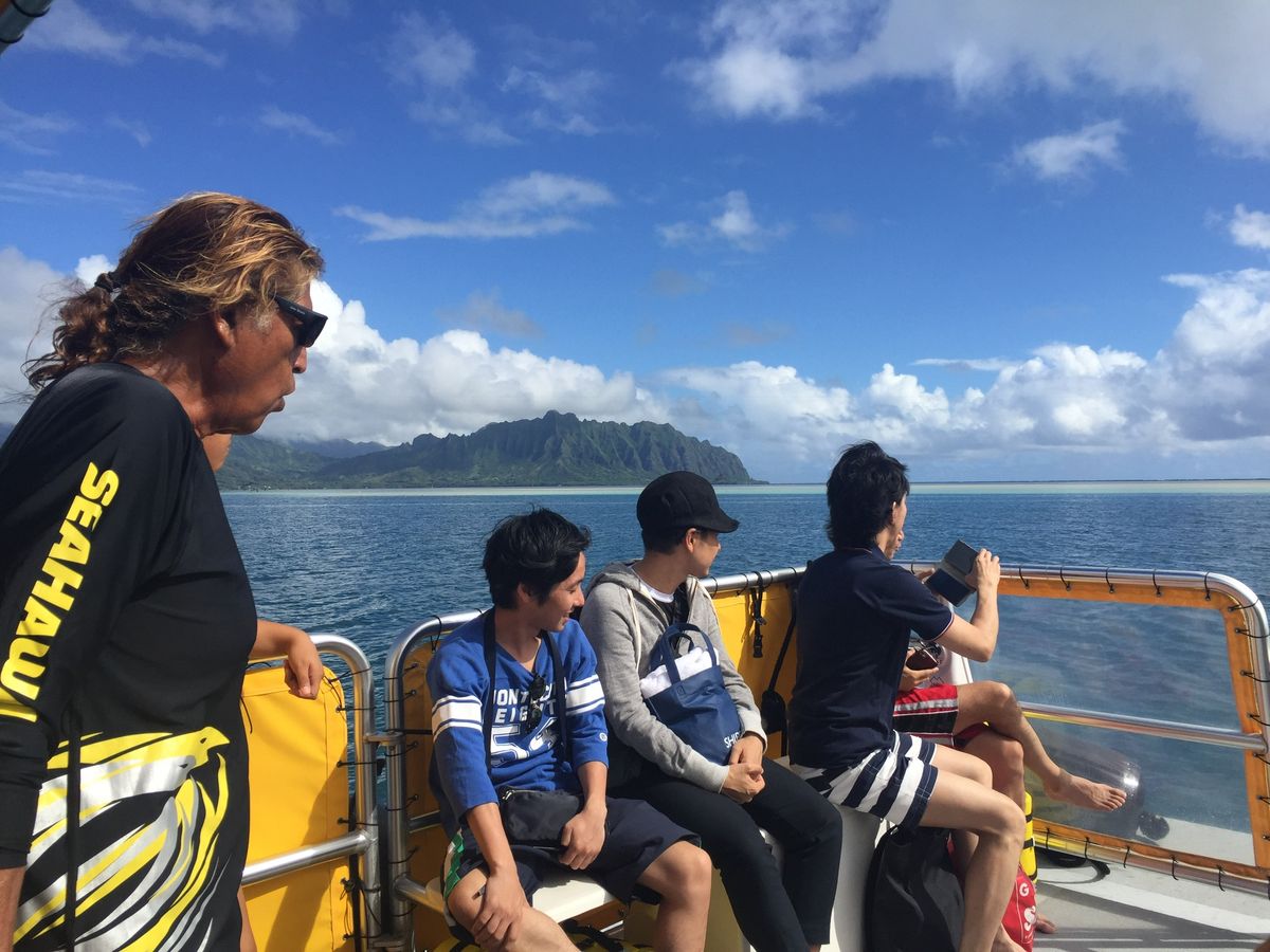 ワイキキから40分程離れた海岸から船に乗り換えてサンドバーへ向かい、そのサンドバーで30分程散歩及び写真撮影会を行う時間があり、その際もガイドさん(日本人)が快く写真撮影に応じて下さり、大変素晴らしい写真の数々が手に入りました!そこからまた船でシュノーケリング出来るポイントまで移動し、小一時間ほど足ヒレ、ライフジャケット、ジュノーケリングセットを装着しシュノーケリングを楽しみました!海の中で自分たちは2回ウミガメに遭遇しました!あまりの興奮と突然さに少しの時間しかビデオに収めることは出来ませんでしたが、ウミガメに会えた感動は忘れられない思い出になりました!時期のせいか海の水が冷たく、船の上に上がっても寒さで震えが止まらなくなりましたので着替え・上着の準備はお忘れなく!!外国人ガイドも優しく、ウミガメを見つけた際は大きな声で知らせてくれていました!