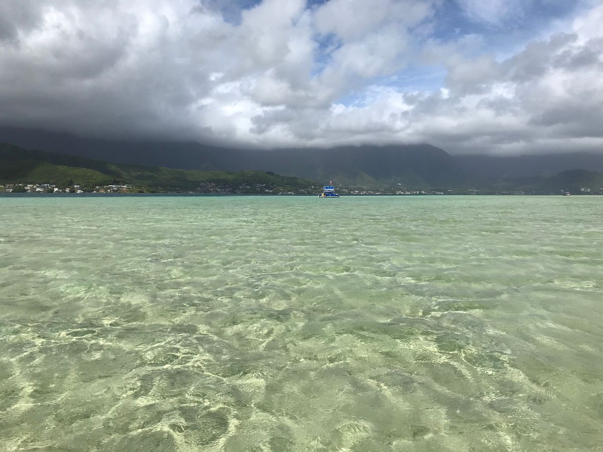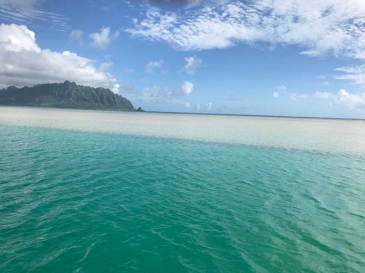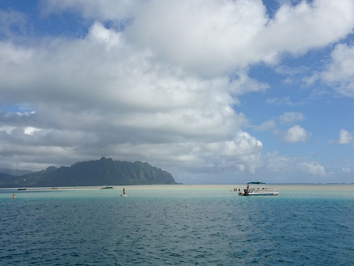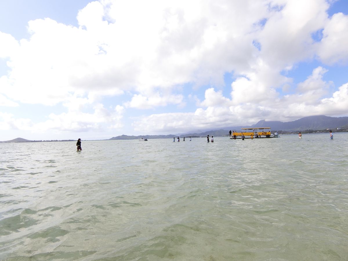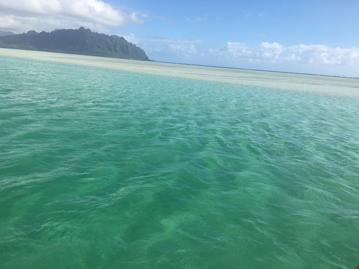 ワイキキのホテルで日本語のお上手なドライバーさんにピックアップしていただき、カネオヘ湾へ。潮位はちょうどよく、ボートを降りた所は膝くらい。防水ケースがなくても、スマホを持って海に出れました。
