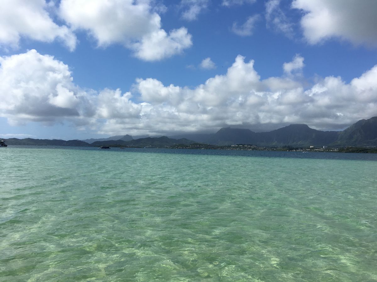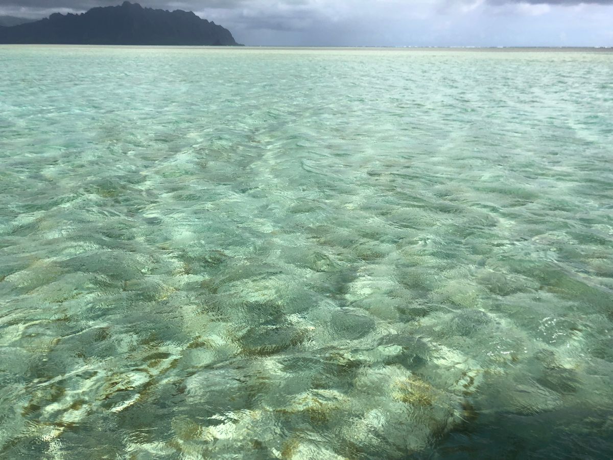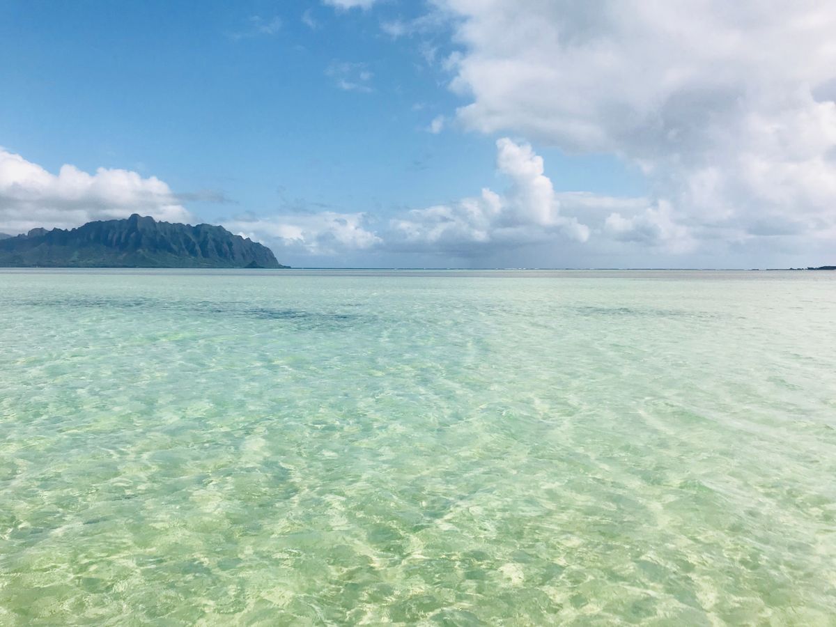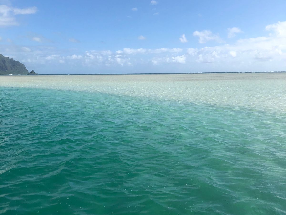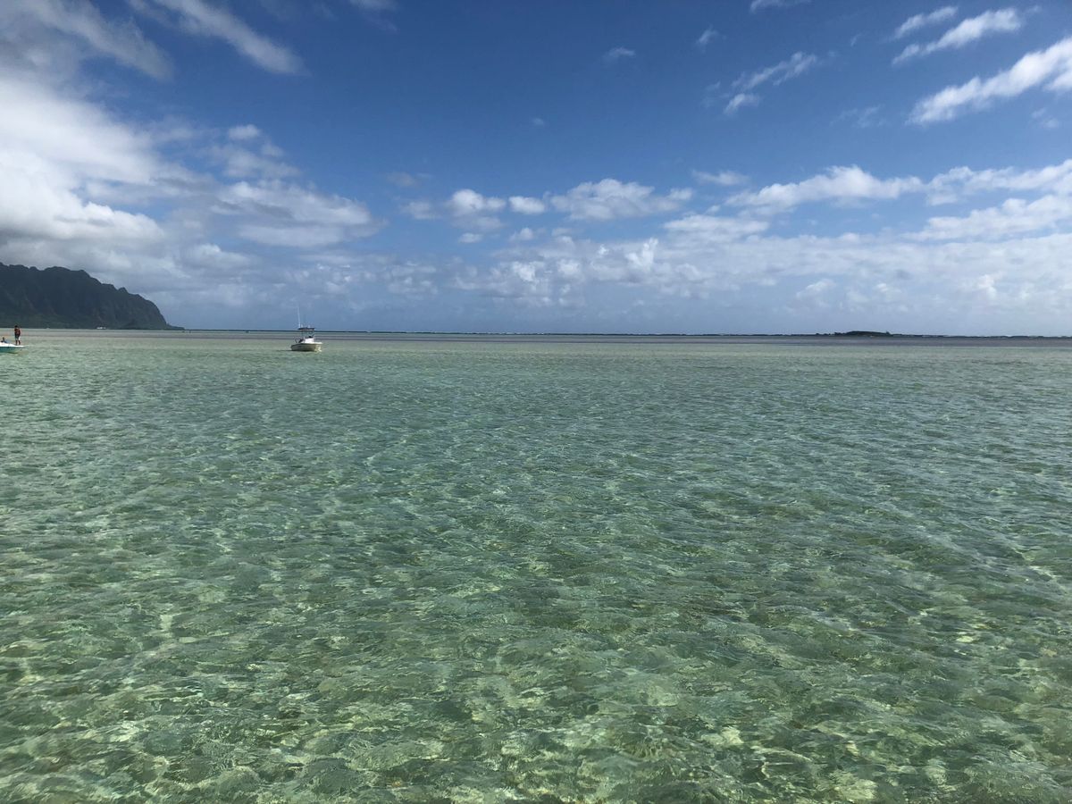 ワイキキのホテルで日本語のお上手なドライバーさんにピックアップしていただき、カネオヘ湾へ。潮位はちょうどよく、ボートを降りた所は膝くらい。防水ケースがなくても、スマホを持って海に出れました。