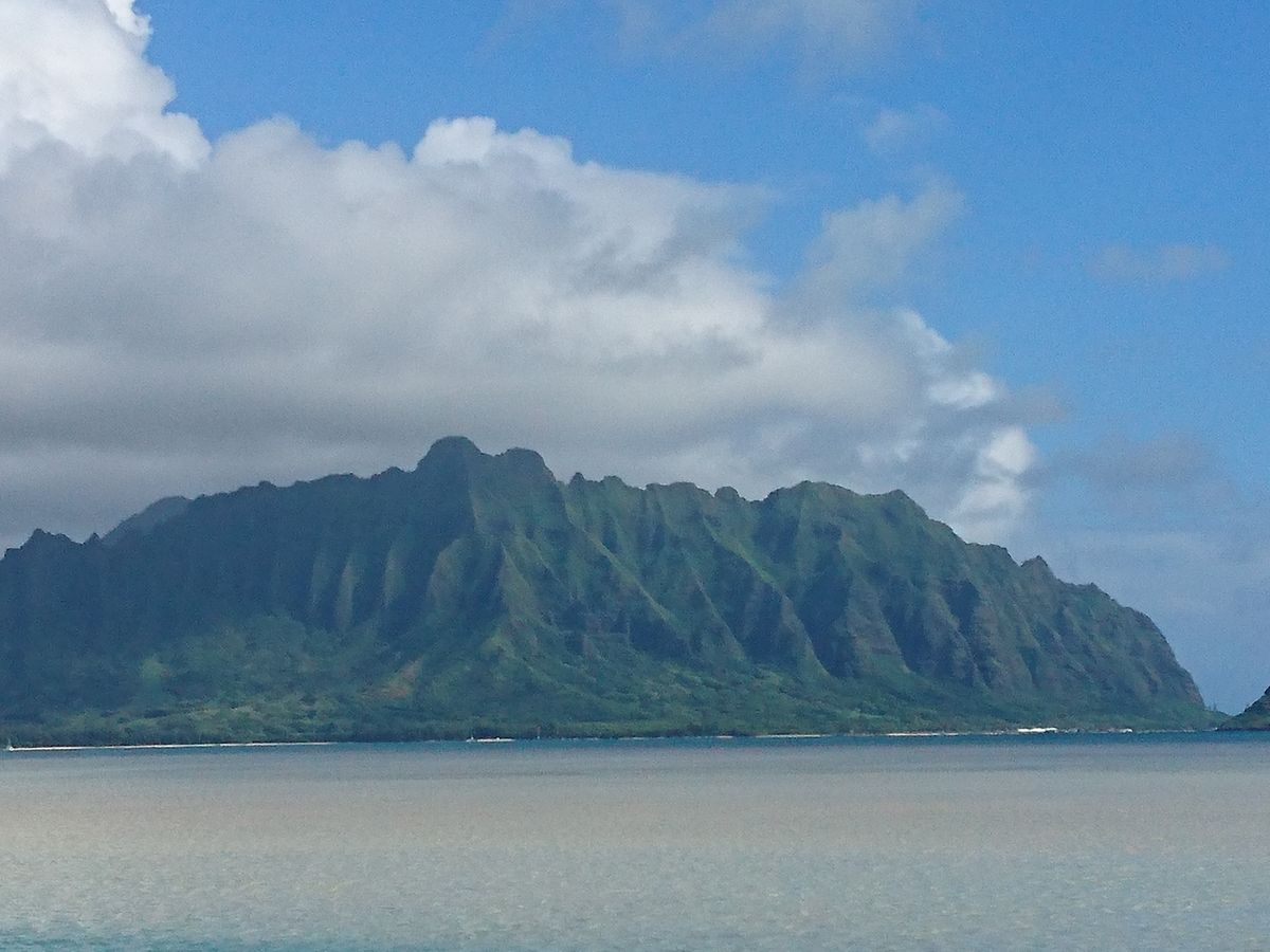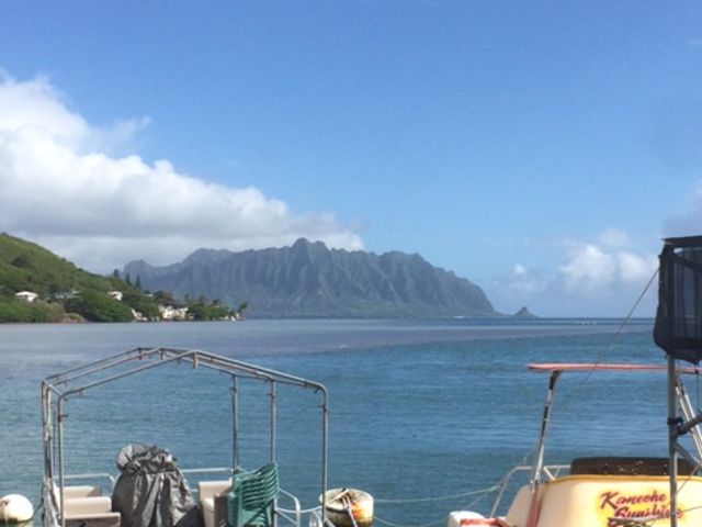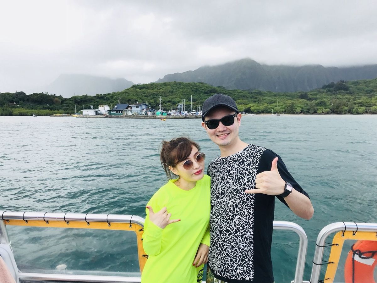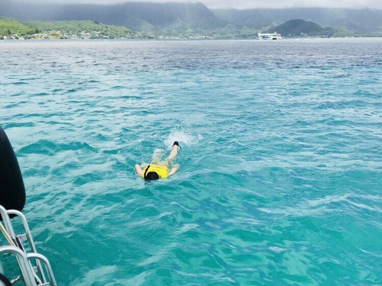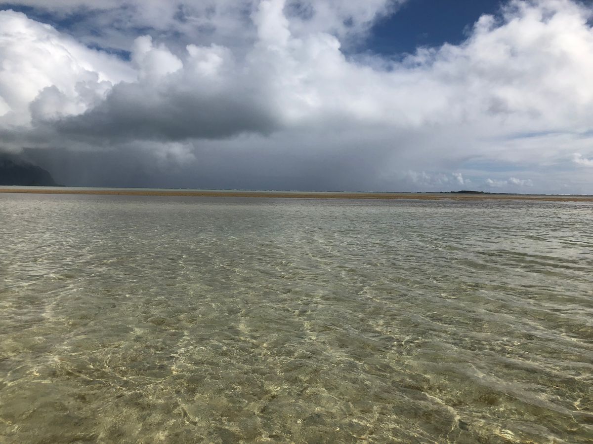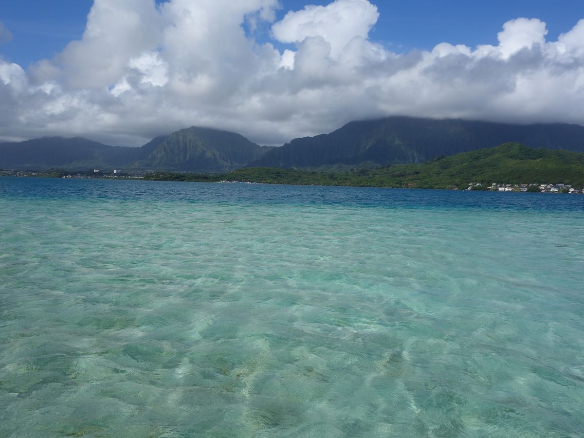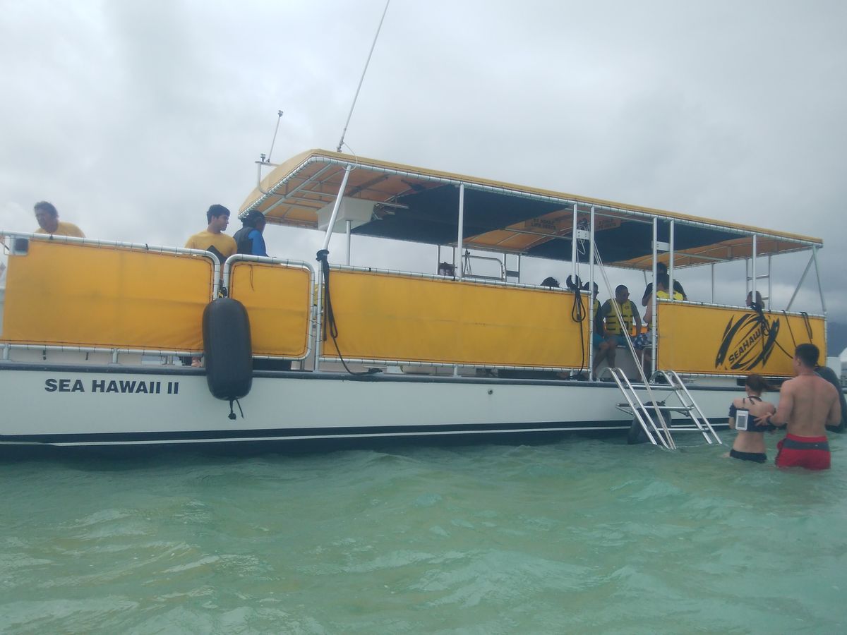 ワイキキのホテルで日本語のお上手なドライバーさんにピックアップしていただき、カネオヘ湾へ。潮位はちょうどよく、ボートを降りた所は膝くらい。防水ケースがなくても、スマホを持って海に出れました。