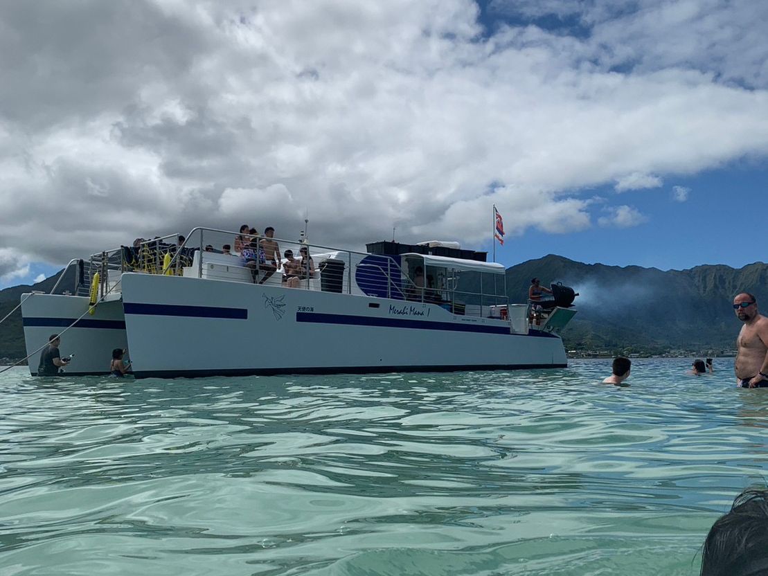 イリカイホテルから約50フィートの場所で、午前中に完璧なピックアップバスの乗車がありました。運転手に見せるために、購入証明書のコピーを印刷して持っていることを確認してください。バスの乗車時間は約1時間で、カネオヘ湾に向かいました。2隻のボートがあり、一隻は日本語を話すものでした。カネオヘ湾を周遊するボートライドは素晴らしく刺激的で、砂州のスポットに到着しました。砂州では完璧な天気の中、ビーチバレーを楽しみ、美味しいトッピング付きのグリルバーガーとサイドが提供され、二杯目のサービングもありました。子供たちや家族は、バリアリーフのスポットでシュノーケリングを楽しみ、たくさんの魚や海の生き物を見ました。ドックへの帰り道では、多くのウミガメが水面を泳いでいるのを見ました。自然の素晴らしさを感じました!スタッフとボートキャプテンは楽しく、面白く、親切でした!将来もお勧めし、再度利用したいです。