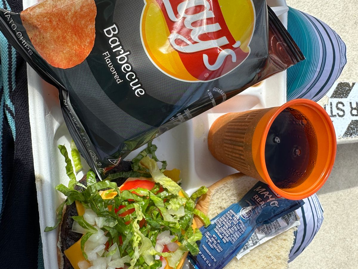 ランチ(チケット価格に含まれているが無料ではない)は、1枚の安価なランチミートを半分に切ったサンドイッチ(ターキーのはずがボローニャのように見えました)、パイナップルのスライス、サラダとしてのレタスの数枚、そしてオプションのチップスの袋で構成されていました。飲み物の選択肢は、粉末ジュースミックスか水でした。最後にホットティーが提供されました。