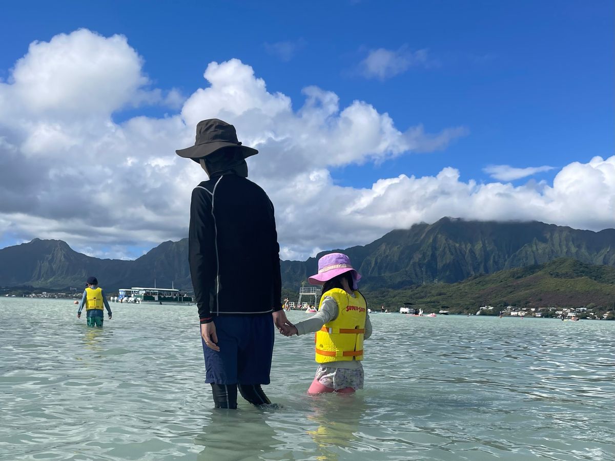 大潮ではなかったので足はついても首まで海水がありました。きれいな海と魚、高山の山々を眺めながら浮かぶ気分はハワイならではと思います。雨が降っても通り雨。海から上がると寒いので上着は必須です。防水携帯ケースを持ってればもっと最高でした。