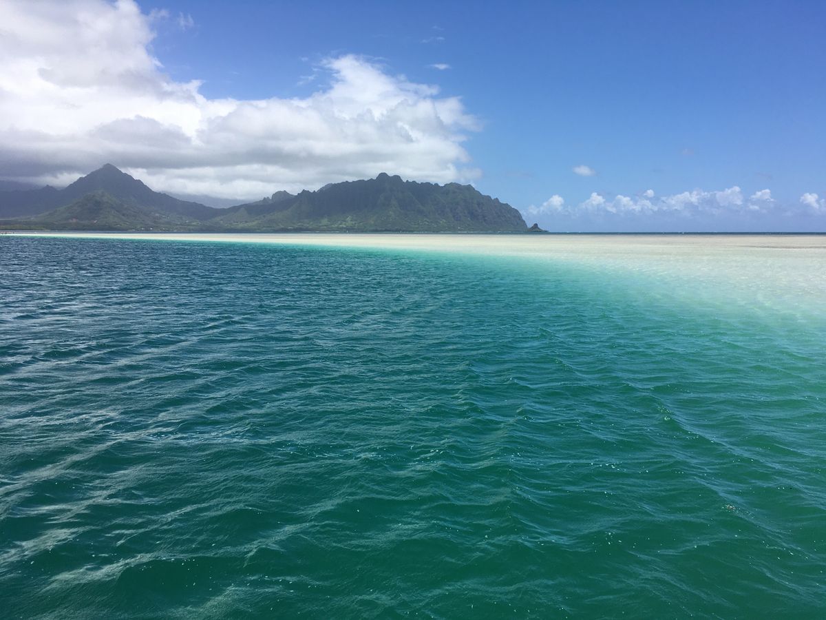 次にカネオヘ湾へクルージング。ボート内でシュノーケルの準備と注意を聞きます。主人はあまりシュノーケリングが上手く出来なくて戻ってしまったので、その後はガイドの女性が手を引いて案内してくれました。サンゴ礁の場所でウミガメ数匹、魚も見られて興奮しました。