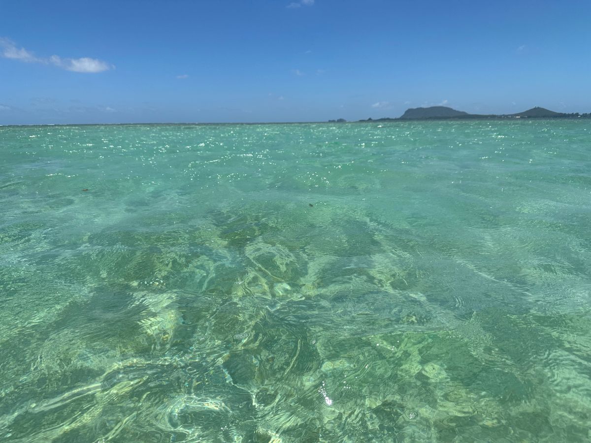バスはサンドバーのスポットへ。ただこの日は干潮が夜中らしく、膝位の水位の場所を歩きました。スマホを防水用に準備していなかったのスマホを持っていかないのを、ボートの男性が気が付い私たちを写真を撮ってくれました。砂浜ではありませんでしたが、周りの景色は素晴らしく感激です。すると、黒い影が。ウミガメです!呼吸するために時々頭を出すのが可愛いです。