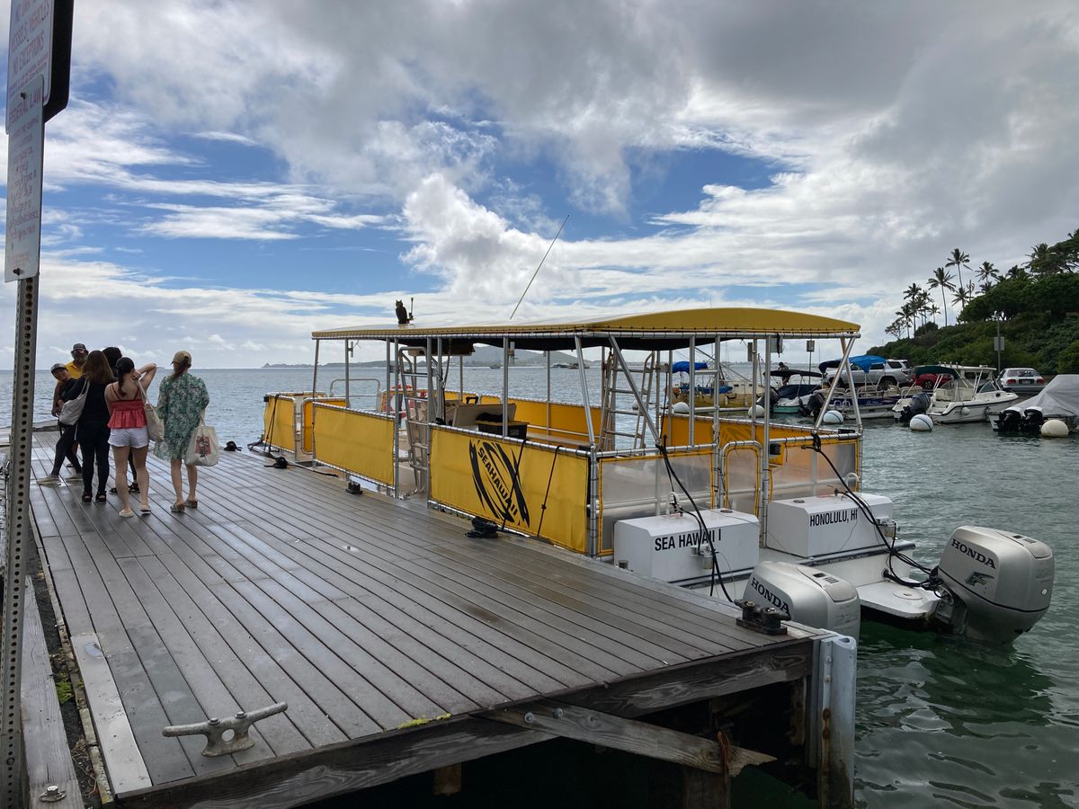 バスで1時間ほど走ったらカネオヘ湾に到着、乗船となります。船着き場にはトイレもありますが、参加客で混雑します。船の中にもトイレはありますのでご安心を。