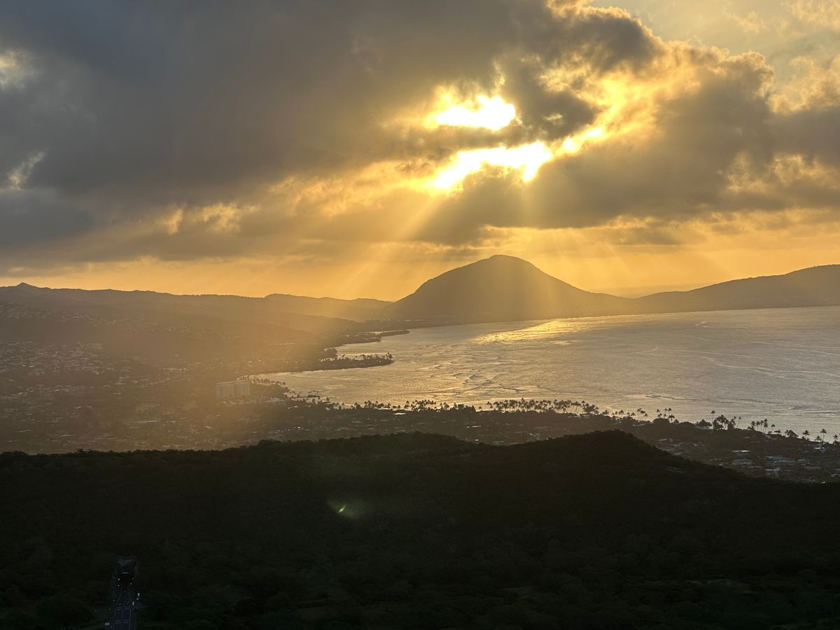 まだ薄暗い朝5時にホテルでピックアップ、ダイヤモンドヘッドへ行き説明を受け7時開門と同時に登山。時期的に日の出も早く30分歩いて頂上に着く頃には日が昇りはじめていたので慌しかったが綺麗な日の出でした。