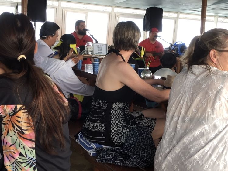 船ではハワイアンミュージックを生演奏してくれるのでそれを聞いたり、軽食のドーナツや飲み物を飲んで過ごしました。