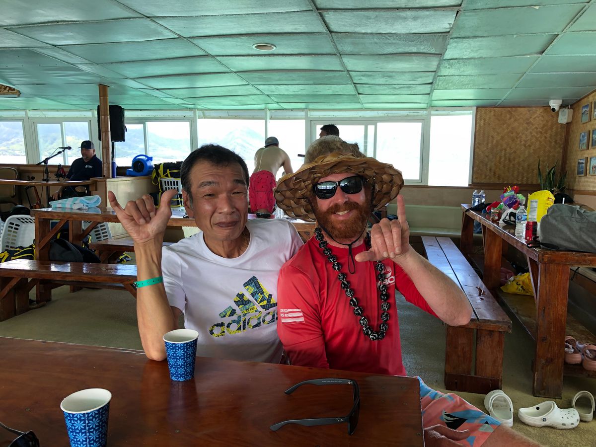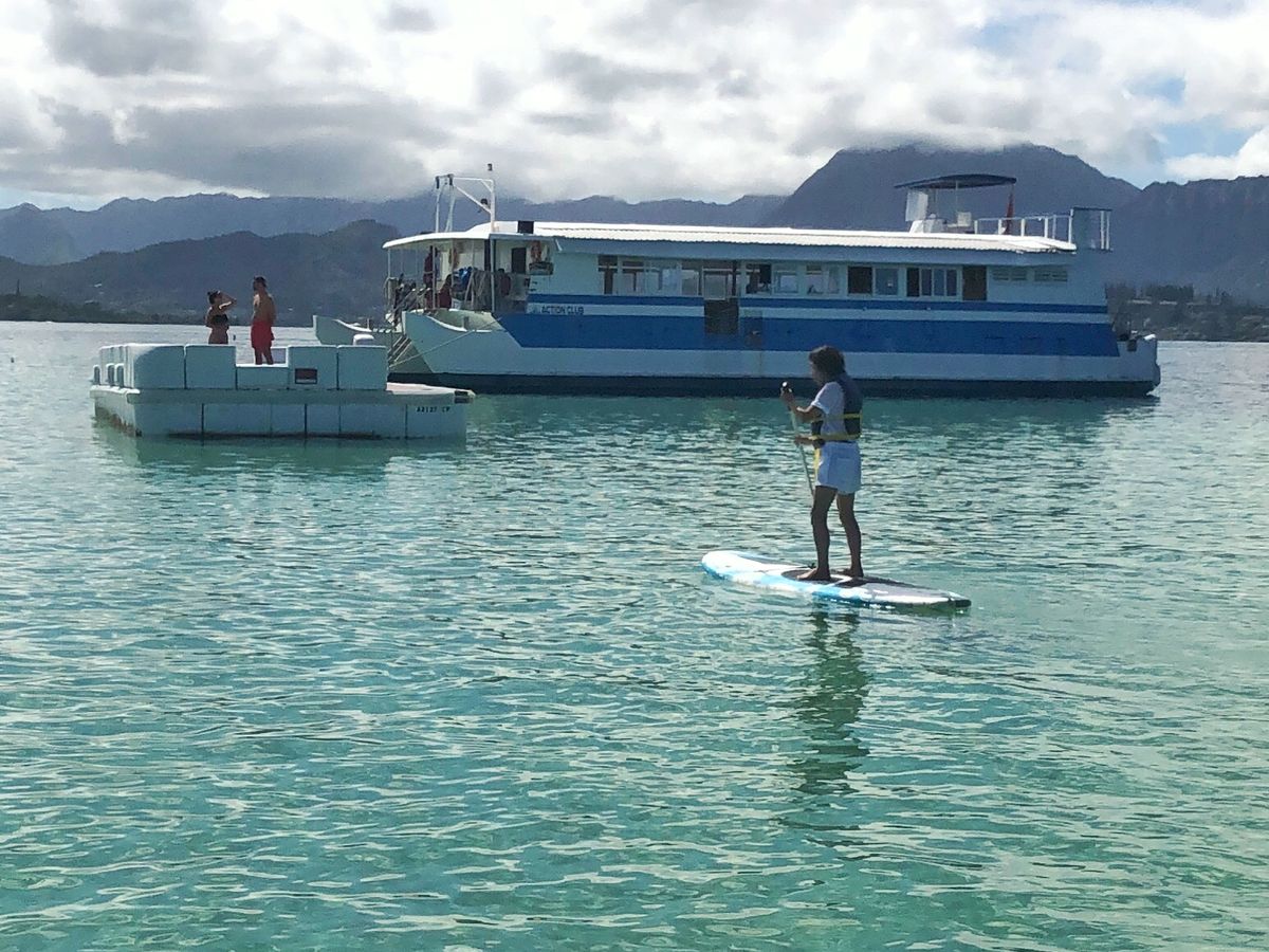還暦を過ぎた夫婦で初めての参加になります。船の中ではハワイアンソングを聴きながら和気あいあいでスタッフの方も英語が話せない私達に片言の日本語でとても親切に接してくれました。(英語ダメでもOK)飲み物やドーナツが有り柔らかくて美味しかったです。お目当てはSUPです!海の中に居るスタッフさんの説明でSUP開始です。恐々乗ってると時期に慣れて気持ち良く乗る事が出来ました。カヤックをやったりシュノーケリングをやったりと充実した時期を楽しく過ごせました。
