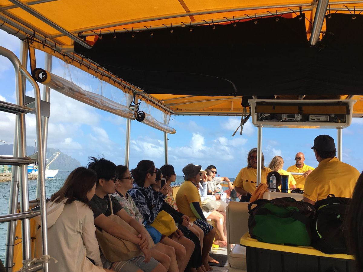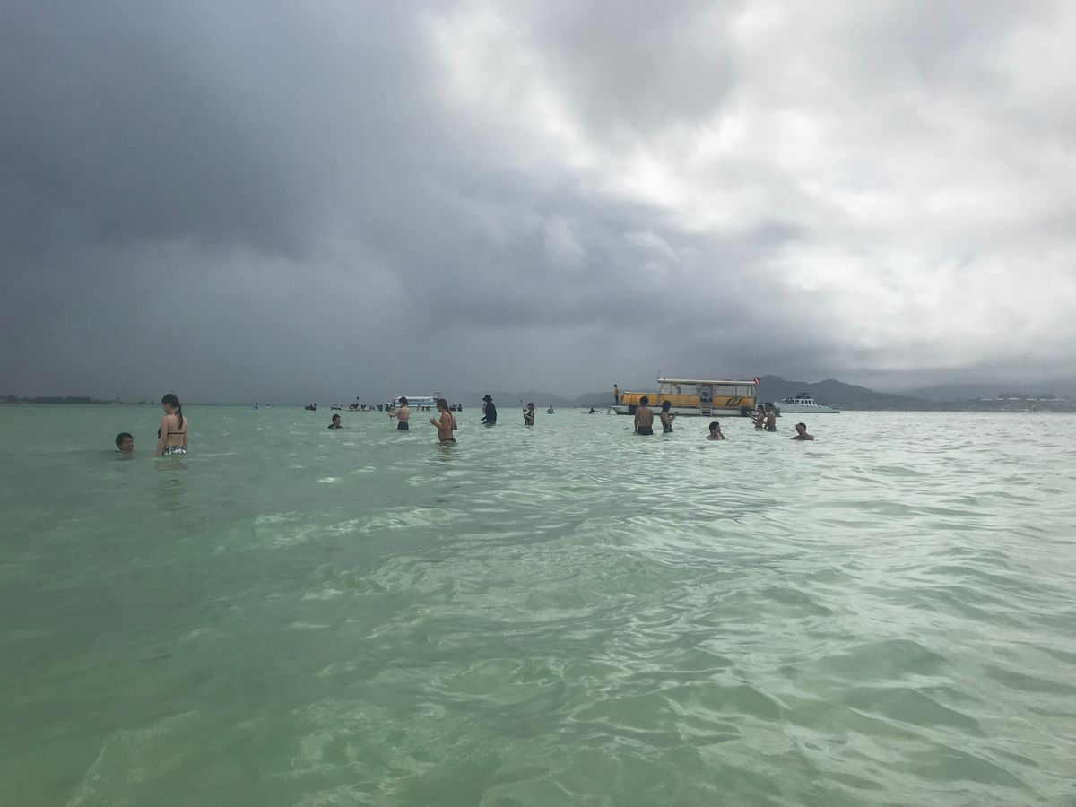 ハワイに行ってもプールサイドで寝てばかりいる私達なので今回はサンドバーも見れるシュノーケリングに参加。牛角でピックアップしてくれたスタッフもサンドバーへ向かうボート内のスタッフも全員外国人でしたが、日本語が話せるので問題なかったです。サンドバーは私達の時は画像のように砂浜が出現してはいなくて、歩けるけどがっつり腰まで海水に浸かりました。(満ち潮とかかな?)ともあれ海ガメが見れるシュノーケリングは80歳のカメも見れたし空気を吸いに水面へ上がってくるカメの近くを泳げたり楽しかった。でも一番楽しかったのはスタッフです。その日が曇りでテンションが下がりぎみな日本人たちを盛り上げてくれて、トイレやシュノーケルマスクや細かな心配りもしてくれて本当に助かりました。帰りにバスを降りた時、ハグしてくれたのも感激。また参加したいです。