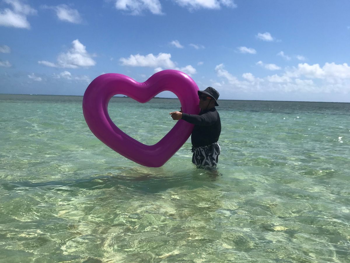 次はサンドバーへ。膝くらいの深さでした。透き通った浅瀬でハートの浮き輪で写メを撮っていただきました。綺麗な海で母は上向きにひたすら浮かんで寝ていました(笑)