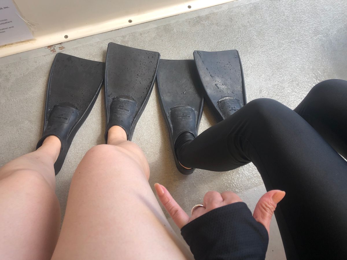 船で救命具と足ヒレ、シュノーケリングマスクをサイズを見て配ってくれます。シュノーケリングに行かない人は行かないと言えば船で待機になります。