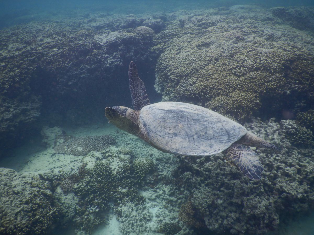 シュノーケリングはボートの近くを少し泳ぐだけと思っていましたが、結構ガッツリ泳ぎます。普段運動していなくて体力には自信がなったのですが、サンゴ礁ときれいな熱帯魚もたくさん見えて、夢中になって泳いでいました。リーダーがウミガメ(ホヌ)を見つけて合図してくれ、何匹か見ることができました。お昼寝しているホヌを見つけたので、結構長い間見ることができました。ホヌを追いかけて海の中を泳ぐ体験は初めてですごく感動しました。