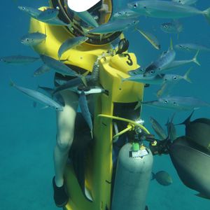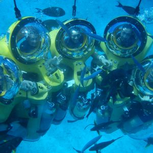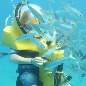 スクーターのヘルメット部分に入る瞬間は、目をつむり海に潜らなければならないけれど参加者1人に対し1人のダイバーさんが付くので大丈夫です。船から海に入る時もダイバーさんが体を支えてくれるので安心です。