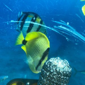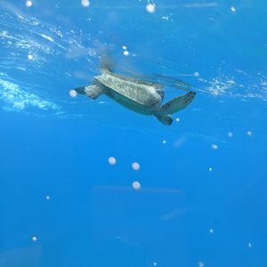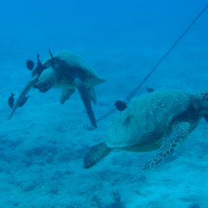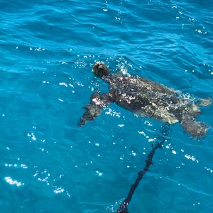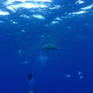 ウミガメがいたのですぐ近くまでスクーターを引っ張って行ってくれました!スクーターには餌が付いていてその餌の網を振ると魚が食べに来てヘルメットの中から写真をたくさん撮れました。海の中は本当にきれいな青色で感動しました。