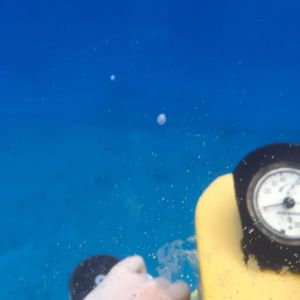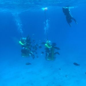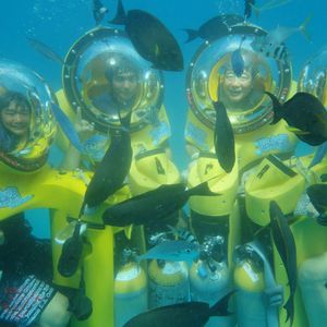 しばらくすると最初に乗った船が来てしてみなさんと合流して少し沖へ移動し水中スクーターをします。スクーターのヘルメット部分に入る瞬間は海に潜ります。 スクーターの操作は全くしていません。ハンドルに手を置いていると手をどけろみたいなジェスチャーを何回かされダイバーがハンドルを操作してなにかしてました。