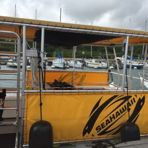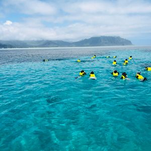 午後にノースショアへ行く予定だったので、送迎ナシでこのプランを選びました。レンタカーで到着し、集合場所の「Deli」のベンチはなかったですが、現地のスタッフが対応してくれて問題なかったです。朝から雨で催行されるのか不安でしたが、雨で準備が遅れただけで二船で15分後に出航しました。全員日本人で、ワイキキからの送迎による参加の方が多かったようです。もしかしたら日本語ガイド付きだったのかもしれません。ときおり強くなる雨の中、酔う事もなく、ウミガメもマンタも見られて、サンズバーは膝ぐらいでしたが、上陸出来て大満足です。シュノーケリングはあまり期待してなかったのですが、ライフジャケットがあり、泳げなくても全然大丈夫です。40人ぐらいでサンゴ礁に沿って数列で泳ぐ形でしたし、時間も限られ往復同じ経路を泳ぐため混みこみで、前の人の足があたるか、サンゴに足が当たるかに気をとられ、魚を見るよりそちらを気にして子供は怖がっていました。船で待っていても良かったかもしれません。参加者の皆さん、素直に二人いる日本人?女性スタッフの言うことに従っておられましたが、一人は親切、一人は上からな態度が隠せないスタッフでした。最初どちらの船に客を割り振るかの時点で、送迎バスで参加していない人の人数を把握していないのか、日本語が実は不自由なのか、乗船制限を超えて割り振った挙句、勝手に乗り込んでいる客がいるかのように横柄に振る舞い、言った言わないの水かけ論の後、謝ればいいんでしょ!と日本語でわめき、その後も忙しく準備している同僚に対し英語で自己主張し、こちらに全部非があって、完全に変な客扱い・発言で、ハワイに来て違った意味で興味深い体験でした。英語圏の人がいたらあの振る舞いはないでしょうね。でも雨の中嫌な顔一つ見せず頑張っていた現地スタッフの方たちの働きには頭が下がりました。港にはシャワーがない様子なので、タオルや防寒具など濡れた水着のまま帰る準備をしておいた方が良いと思います。荷物は船に残しておけますが、防水バッグ等はないのでそちらの準備もしておくと良いです。